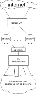 Quazy Posted April 27, 2009 Posted April 27, 2009 (edited) Поделитесь, пожалуйста, соображениями, а лучше практикой :) распределения нагрузки на несколько шейперов. Схема примерно такая (в аттаче). Т.е. имеется некоторое кол-во абонентских /24 сетей, шлюзом прописан L3 SR (соответственно на нем подняты ip интерфейсы), далее стоит шейпер (на который с L3 по default маршруту заворачивается трафик). Настал тот час, когда один PC перестал справляться, апгрейдить его нечем. Сейчас стоит core2duo 3.33Ghz, FreeBSD7, драйвера для em от яндыкса. Попробовали воткнуть core2quad 3Ghz - не оттянуло... Нужно каким-то образом распределить нагрузку на несколько шейперов, прозрачно для клиента. L3 - поддерживает PBR, OSPF (ECMP). Edited April 27, 2009 by Quazy Вставить ник Quote