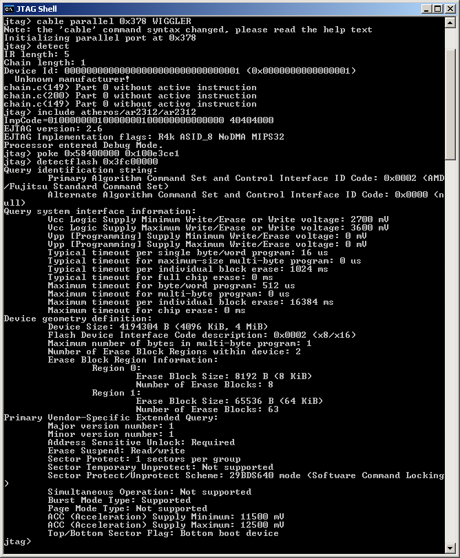 dolphinik Posted April 25, 2009 Posted April 25, 2009 Ребята, помогайте. Не могу понять в чём дело. Попробовал залить в 7100AP бут от 2100. Залил. Завелось всё кроме сетевух. Потом не отпаивая JTAG подпаял консоль. Всё работало. Утром нашёл бут от 7100, загрузился в убунту, запустил jtag и начал заливать, но процесс прошивки остановился секунд через 20. После этого на упор отказался работать detect. два раза каким-то непонятным образом послевключения/выключения компьютера detect прошёл, но с прошивкой та же беда. не заливается. Загрузился в винду, скачал URJTAG. В нём detect проходит, но пишет что Unknown Manufacturer и бут всё равно не заливается. Вставить ник Quote