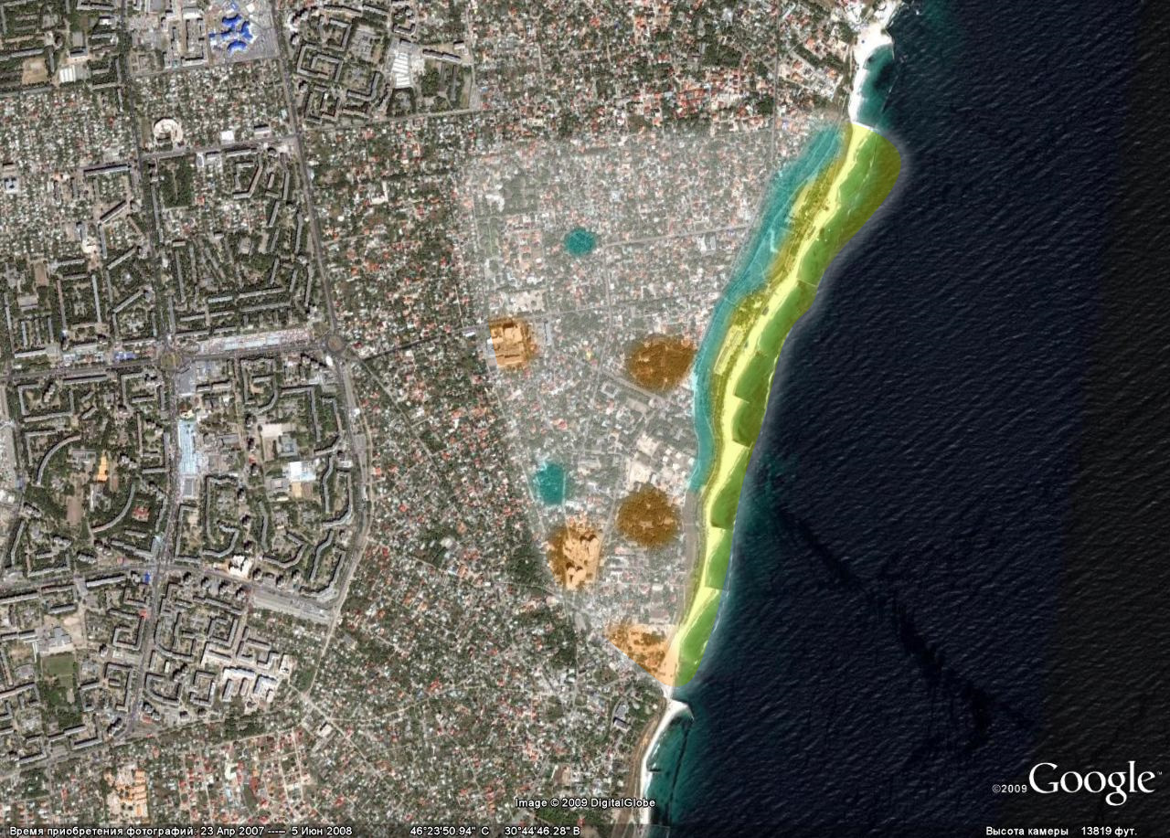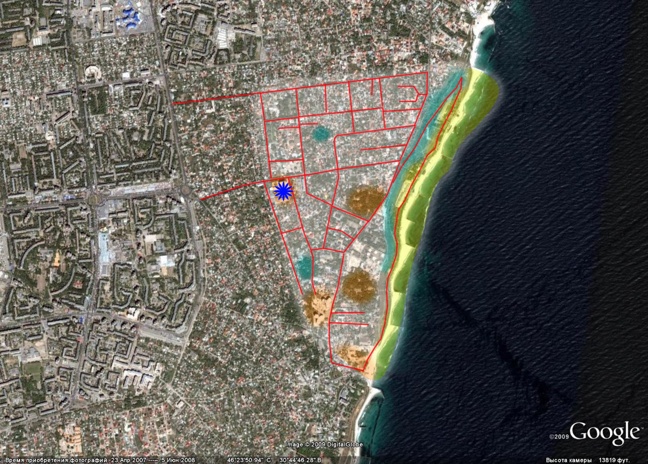 Hansik Posted May 2, 2009 Posted May 2, 2009 День добрый. Давно читаю форум, но тут решил обратиться за советом. Летом защищаю диплом на тему: создание покрытия Wifi в частном секторе. Читал темы. где люди интересовались как создавать такое покрытие в реальных условиях. У меня немного по другому:) как в сказке. Денег много, все лицензии есть. Местность, где будет разворачиваться сеть: ровная. За основу взят городской район города Одессы, прибрежная зона. К посту прикрепил изображение. Внизу координаты местности, белая зона - рабочая зона, внутри которой необходимо предоставить возможность подключиться к сети. Оранжевым цветом (ну сейчас он скорее коричневый), обозначены места с большей плотностью заселения или кол-м возможных одновременных подключений (высотные дома, санатории). Голубым - зоны где плотность заселения очень мала. Зеленая зона - прибрежная зона. Почему ее выделил - прибрежная зона находится на уровне 3-4 метров относительно уровня моря, а уровень жилых построек на уровне 50-80 метров (т.е. между жилыми постройками и прибрежной зоной - склон). Необходимо обеспечить клиента максимальной скоростью в 5 мбит/с. Примерные размеры площади покрытия: 2 на 1 километр Почитав форум и литературу, понял, что реализовать проект на сплошном WiFi'е глупо. Решил совместить беспроводную сеть с проводной. Скажем делить всю зону покрытия на соты, радиусом 100 метров - 100 метров взято из расчета стабильности работы сети Ethernet на витой паре. Связь соты с сервером беспроводная, внутри соты - проводная сеть. На втором рисунке, синим "цветком", изображено месторасположение сервера (высотное здание, одно из самых высоких в данном районе). Вопрос: разумно ли в данном случае совмещать беспроводную и проводную сеть? Напомню, что это только проект, который останется на бумаге. Вставить ник Quote