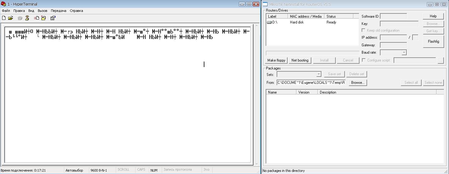 SSD Posted June 22, 2010 Posted June 22, 2010 1) схема распайки кабеля + собственно кабель - http://www.mikrotik.com/testdocs/ros/3.0/a...ial_content.php2) netinstaller - http://www.mikrotik.com/download/netinstall-3.25.zip 3) запускаем любую терминальную программу(мы юзади стандартную виндовую hiper terminal)с параметрами - скорость 9600, биты данных 8, чётность нет,стоповые биты 1, управление потоком нет. 4)включаем МтиК и видим в терминале - нажмите 2 сек любую кнопку чтобы запустить меню - жмём, появляеться меню-всё что тут нужно сделать это в БУТЕ указать загрузку с ethernet 5) запускаем netinstaller - тискаем кнопочку net booting, и там указываем ip который выдасться мёртвому МтикУ (типа мини дшсп сервер)-указывайте его с учётом того какие ip у вас на компе -с одной подсети имею ввиду, дальше включаем мертый МтиК,в терминале видим уже другие буковки и в netinstaller в правом верхнем краю видим что прога подгрузала наш роутерборд, считала его ID и ключ под вашу лицензию, ниже есть кнопку- кип олд конфигурейш - собственно ставим галку если хочем хтобы настройки оставились, и внузу есть кнопка browse чтобы выбрать собствено прошивку, которую вы неудачно залили, дальше жмём кнопку install и ждём пару минут, он перегружаеться и слышим очень приятный знакомый звук пик-пик ))) Жыл был себе роутербоард RB433AH с картой R52HN. Работал базовой станцией. Нагрузка совсем детскаяя - 3 клиента, трафик не более 1 Мбит. Проработал около месяца и начали наблюдаться ребуты и подвисания (реже) примерно 1-3 раза в сутки. Сначала грешил на перегрев, так как стояла дикая жара. Но жара спала, а ребуты не прекратились... Решил для пробы откатиться с 4.9 на 4.6. Залил через винбокс пакеты 4.6 для mipsbe, зашол в system>package>downgrade, нажал подтверждение. Ждал долго..., но борд так и не загрузился. Кнопки ресетов не помогают, девайс не видится ни винбоксом, ни по вебморде, полный труп, только при включении подмигивают светодиоды езернет портов. Ну взял нульмодемный кабель(распайку проверил), нацепился гипертерминалом, как написано выше, а в ответ практически тишина, только при включении выдает в терминале пару символов: пробел,>,непонятно что, и Р. Вопрос: Я что-то не так делаю или борду пришел конец ? Делаю так: запускаю гипертерминал, потом включаю питание на борд. Неужели возможно так просто убить этот девайс ? Помогите плиз, кто сталкивался с таким, жалко выбрасывать, совсем новый, три месяца как куплен. У Вас видимо не правильная кодировка в гипертерминале стоит. Вставить ник Quote