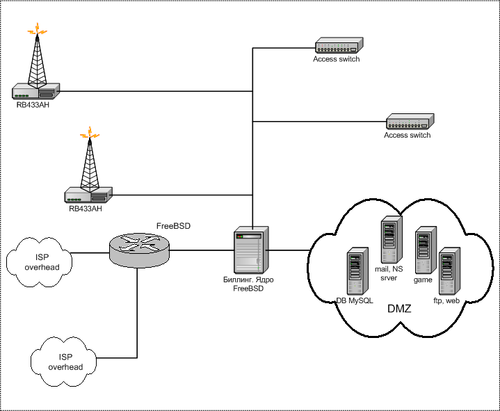 qso Posted August 5, 2009 Posted August 5, 2009 (edited) Доброго времени суток всем! Думал долго, оценивал все за и против. Но пока не пришёл к нужному решению, так как есть свои + и - ы. А именно размещение авторизаторов и точек входа клиентов в сеть. Что нужно, есть железо микротик RB433AH, есть машина P-IV, на его платформе сгенерировать ядро биллинга, там есть 3 интерфейса смотрящие сторону роутера, в ДМЗ, и в сторону вн. сети. У меня возникла дилемма, где размещать точки входа клиентов, на самом сервере ядра или на самих микротиках. Все без исключения юзеры должны конектится посредством PPPoE туннеля, будь то радио, будь то кабельное подключение. Есть варианты настроить микротик в режим бриджа и все туннели (радио и кабель) терминировать на сервере, или по радио сделать терминацию на МТ, т.е. они в роли NAS, а кабельных юзеров уже на сервере терминировать. Мне говорили что если на МТ запускать сервер PPPoE, то это вызовет лишнюю нагрузку на RB, в то же время гонять по радио лишний трафик туннелей тоже, как бы нерационально. Посоветуйте плиз, как сделать лучше. Заранее благодарен. Схему сети для более детального понимания прилагаю. Edited August 5, 2009 by qso Вставить ник Quote