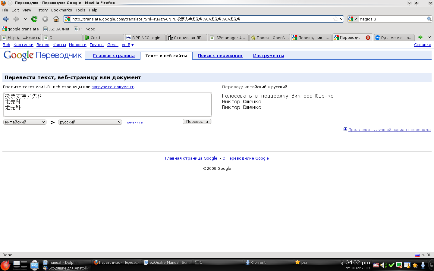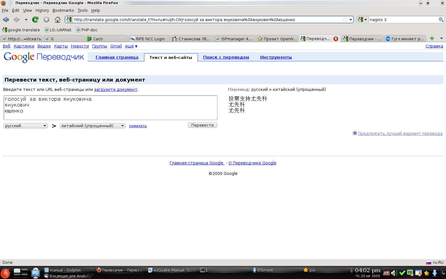 t0ly Posted August 20, 2009 Posted August 20, 2009 (edited) переводит простые слова в русского на китайский голосуй за виктора януковичаянукович ющенко результат потом берём результат перевода, который уже с виду "старыннй" 投票支持尤先科尤先科 尤先科 и переводим обратно с китайского на русский результат интересно это кто то таки хорошо заплатил или баг? Edited August 20, 2009 by t0ly Вставить ник Quote