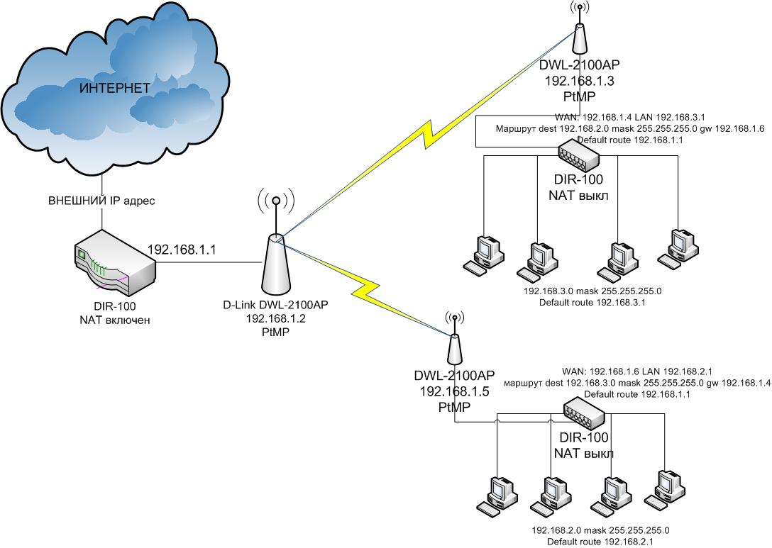 SSD Posted October 29, 2009 Posted October 29, 2009 Подскажите пожалуйста можно ли на базе DWL-2100AP и DIR-100 сделатьсетку как на изображении. Имеются 2 офиса. Прямой видимости нет. Связь планируется через корневую точку на которой есть еще и интернет. Необходимо чтобы компьютеры из обеих офисов "видели" друг друга и интернет. Плюс к этому надо иметь возможность управлять доступом по МАС адресам и ограничивать канал каждому компу. Можно. Только на длинках с адресами 1.3 и 1.5 используется режим р2р. Вставить ник Quote