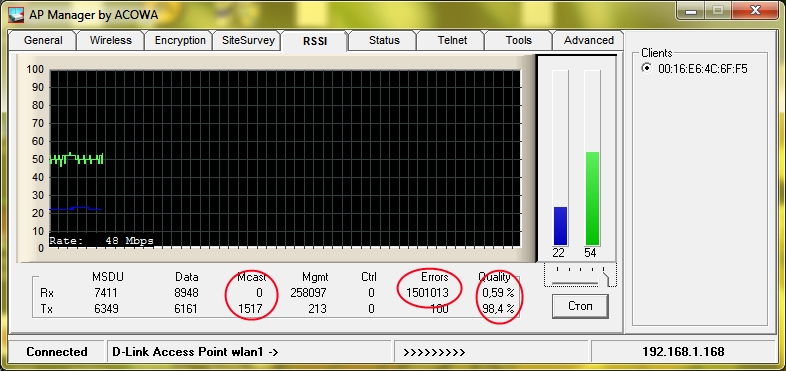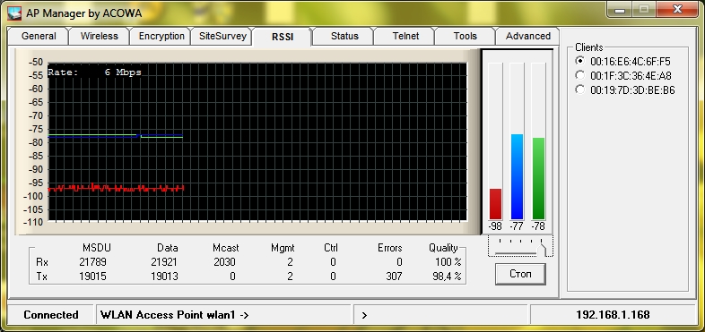 tofu Posted November 11, 2009 Author Posted November 11, 2009 (edited) Прошил в ББ пока только AP, в целом доволен, но началась вот такая пляска со стороны клиента, по-моему это ненормально. в чем причина?... блин, немогу прикрепить картинку... вот она Вот конфиг клиента: D-Link Access Point wlan1 -> get config wlan1 revisions: mac 5.8 phy 4.4 analog 4.6 PCI Vendor ID: 0x168c, Device ID: 0x13 Sub Vendor ID: 0x168c, Sub Device ID: 0x13 chip is AR2312 Country Code: GB Operation Mode: Wireless Client Remote AP: 00:21:91:7E:CC:32 Wlan State: Enabled Radio Frequency: 2457 MHz (IEEE 10) Wireless LAN Mode: 802.11g Auto Channel Select: Disabled Extended Channel Mode: Enabled Data Rate: 6 Antenna: 1 Login Username: admin RADIUS address: Name server IP address: Name server domain suffix: SSID: ex-link SSID Suppress Mode: Disabled System Name: D-Link Access Point Beacon Interval: 100 DTIM: 1 Fragmentation Threshold: 2346 RTS/CTS Threshold: 2346 Short Preamble: Disabled 11g Only Allowed: Disabled CTS Mode: AUTO CTS Rate: 11 Mbps CTS Type: CTS-ONLY 11g Overlapping BSS Protection: Disabled 11g Beacon Rate: 1 Mbps 11g Draft 5.0 compatibility: Disabled Short Slot Time: Enabled Basic 11g Rate Set: (1, 2, 5.5, 11) 11g Optimization Level: 1 Burst Time: 2 Burst Sequence Threshold: 3 IP Address: 192.168.1.201 IP Mask: 255.255.255.0 Host IP Address: 0.0.0.0 Gateway IP Address: 192.168.1.1 SNTP/NTP Server IP Address: Time Zone: 27 HW Transmit Retry Limit: 4 SW Transmit Retry Limit: 3 TransmitPower: full Current Transmit Output Power 21.0 dBm SuperG :Disabled Encryption: Disabled Cipher selection: WEP Authentication Type: Open-System Default transmit key: 1 Shared Key 1, size 40, 0000000000 Access Check: Disabled Key Entry Method: hexadecimal Group Key Update Interval: 1800 seconds Key Source: flash Aging Interval: 300 seconds Calibration Period: 30 seconds Software Retry: Enabled WDS: Enabled Watchdog: Enabled Telnet Access: Enabled Telnet Timeout: 180 seconds Minimum rate: 1 Mbps XR Poll interval: 100 msec XR Frame Limit: 25 XR Poll Rate String is 0.25 1 1 3 3 6 6 20 XR Fragmentation Threshold: 540 D-Link Access Point wlan1 -> Пробовал Current Transmit Output Power ставить 17.0 dBm и 19.0 dBm ставновиться значительно хуже. Edited November 11, 2009 by tofu Вставить ник Quote