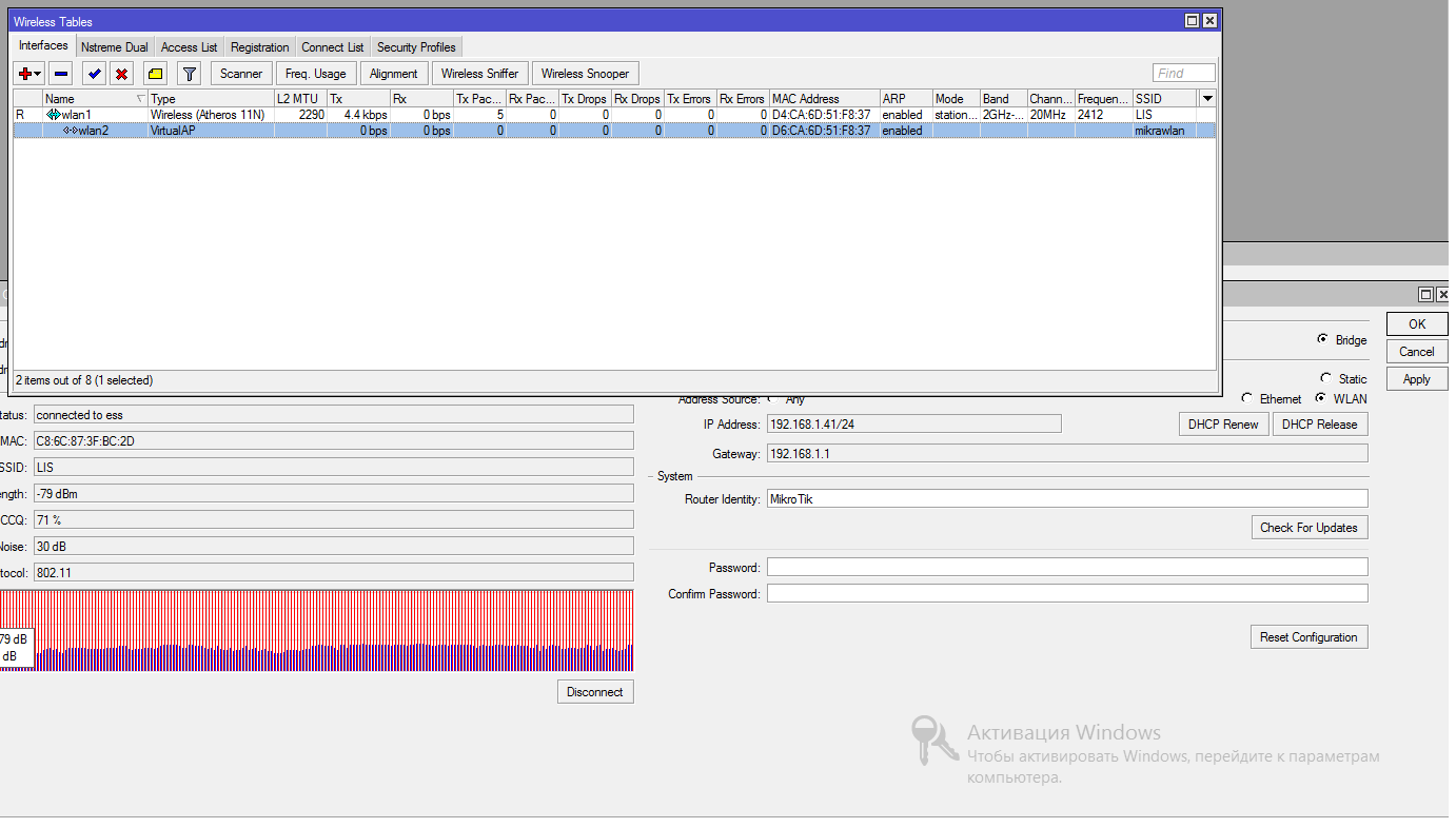 Saab95 Posted May 6, 2013 Posted May 6, 2013 Активной она будет как вы к ней подключитесь. Если добавили в бридж и у вас работает по кабелю, то так же должно работать и через вторую точку, только наверно вы не сбросили начальный конфиг, поэтому и получается ерунда. Сделайте как тут - http://www.lanmart.ru/blogs/mikrotik-rb751u-2hnd_rezim-besprovodnyj-router/ - только вместо Ether1 канал интернета будет Wlan1, который вы настроите в режим Station. Далее создаете Virtual AP и добавляете ее в бридж. Теперь можете и по кабелю, и по радио получать интернет. Как настроить Virtual AP можете посмотреть тут - http://www.lanmart.ru/blogs/mikrotik-rb751u-2hnd_rezim_wds_i_virtual_ap/ - чисто для ознакомления, настройки там немного для другой задачи, хотя сделав по ним так же можете получить репитер, там собственно про подключение к другой сети и указано. Вставить ник Quote