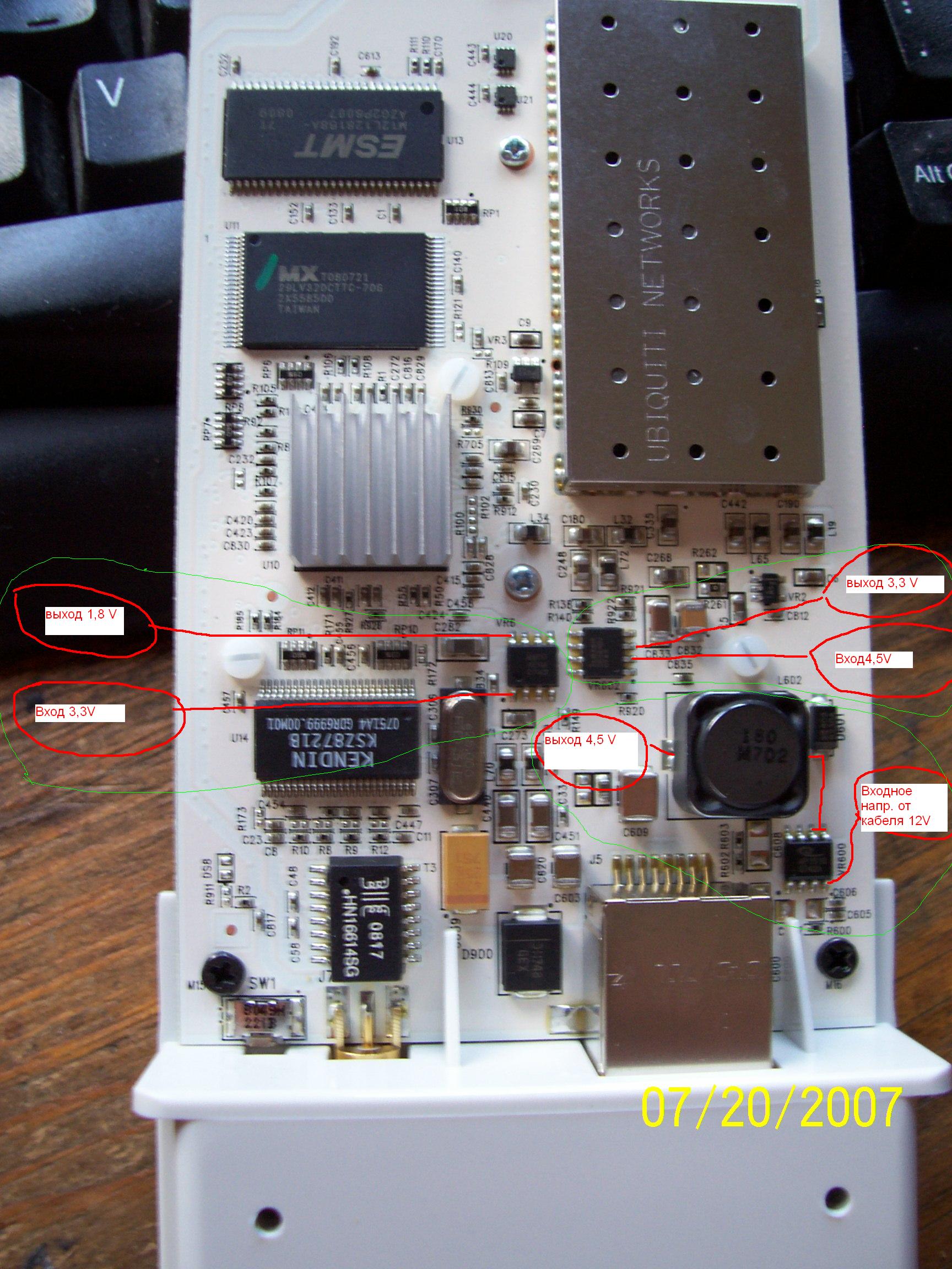sonxxx Posted December 24, 2009 Author Posted December 24, 2009 Вот у меня и продолжение темы вчера установили нанос 5, мощность 14 Db, он не проработал и суток перестал пинговаться. Сняли устройство привезли начали проверять. индикаторы PWR и LAN горят, устройство не пингуется, на сброс КНОПКОЙ не реагирует. Попробовали восстановить прошивку, ввели нанос в режим Red boot, начал пинговаться на Ip по умолчанию, С tftp пытались в него залить по новому прошивку, заливка доходит почти до конца и ошибка. Разобрали устройство, в нем очень сильно греется микросхема с 8 ножками (на ней 8807 AENA 0814) или она вышла из строя или ее что то тянет. Есть у кого схема нанаоса? Есть нанаосы у которых нем мощности, может удаться собрать из нескольких один рабочий.. Может кто может что посоветовать? Вставить ник Quote