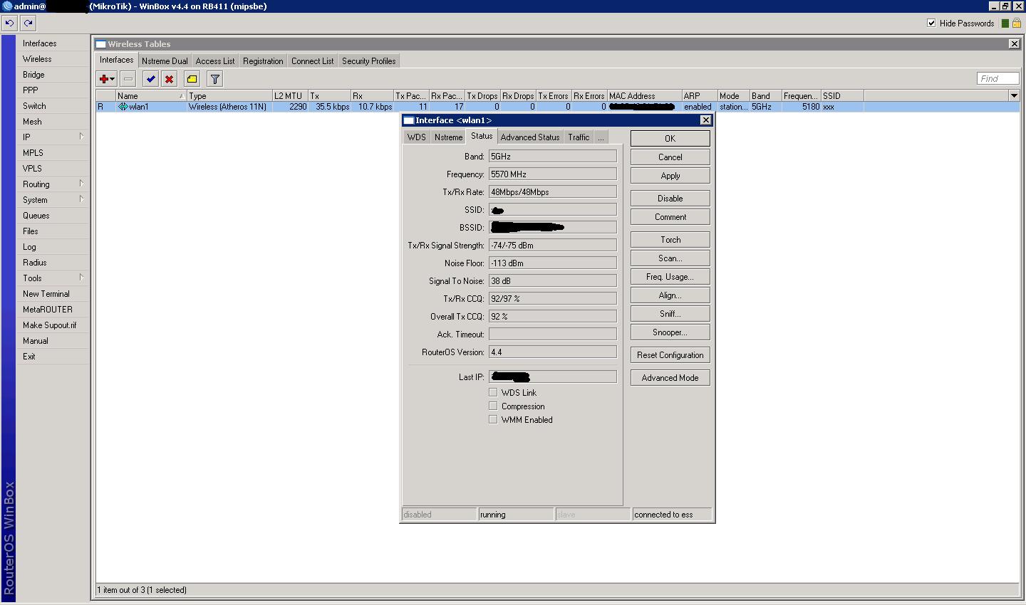 fastvd Posted January 30, 2010 Posted January 30, 2010 привет, коллеги. есть р2р на МТ, на 5 ггц, эфир чистый, все показатели в норме(см атач), топология ап+вдс <-> стейшн+вдс, карты с двух сторон r52n, расстояние 8 км. было всё хорошо, но теперь на стороне клиента линк держится 1-5 сек и тупо отпдает, переключаеш на стейшн псевдобридж и всё гуд, но это временное решение... частоты переключали-ничего не дало...на псевдобридже уже вот 14 часов держится, а на вдс и 14 сек не держится. Вставить ник Quote