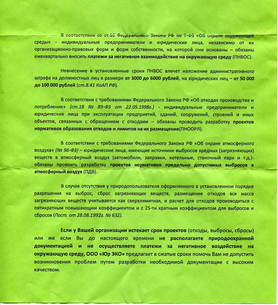 vadya Posted March 4, 2010 Author Posted March 4, 2010 Если Ваша деятельнось заключена в "шум, вибрация, электромагнитные и радиационные воздействия на ОПС", то платить ничего не надо.Как и все здесь провайдеры, только мы очень маленькие. А от кого пришла бумага?(из размещенного документа, видна ссылка только на частную компанию) Да, ООО "Юр ЭКО" г.Ставрополь Вставить ник Quote