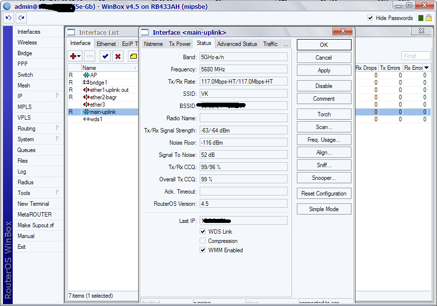 SSD Posted March 6, 2010 Posted March 6, 2010 вот почти главный аплинк на 5 ггц на двух ордах с двух сторон АШ серии в турбо режиме при 5к ппс при 20-25 мбит без фрейм полиси как не странно прогибается- пинг растёт до 100-150 мс...если включаем фрем полиси 3200-4000 то всё гуд но проц 100% что не есть гуд...вот думаю как сэкономить проц...SSD писал что на r52n с дуал антенами в МПЛС выжал больше чем на ВДС...спрашивается- а если на обычных антенах и обычной р52 поднять МПЛС вместо ВДС- что получим?МПЛС не обязательно, по идее достаточно будет ЕоИП. МПСЛ нужен на высоких скоростях. если включаем фрем полиси 3200-4000 то всё гуд но проц 100% что не есть гуд.Какая версия ОС? Вставить ник Quote