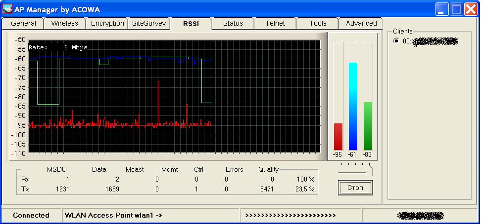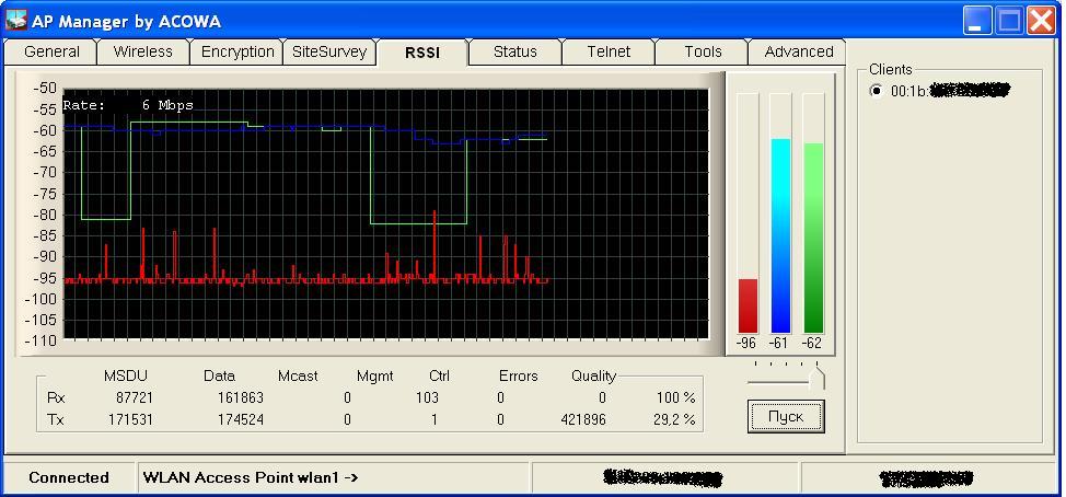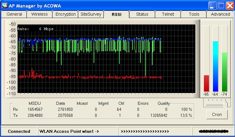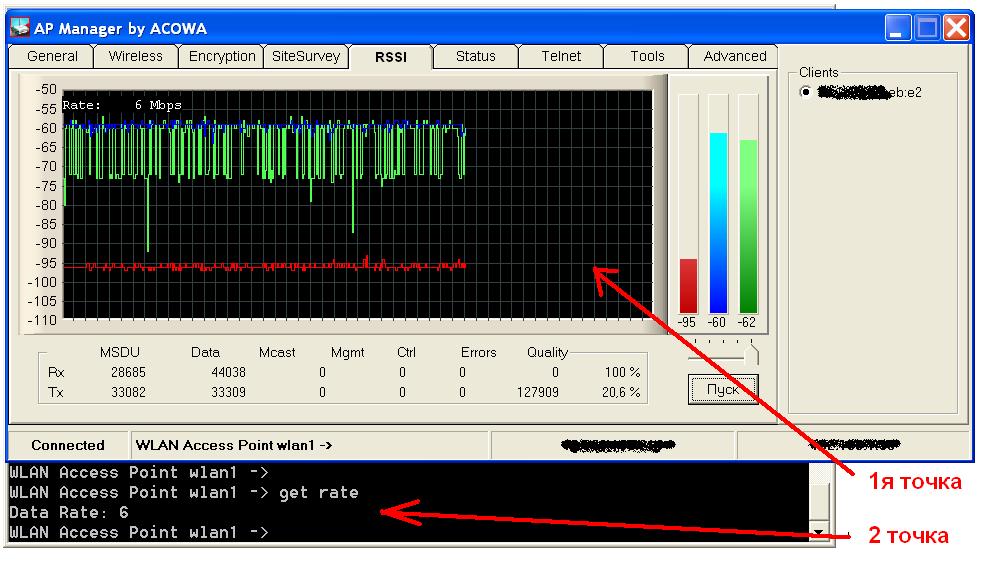 SSD Posted April 17, 2010 Posted April 17, 2010 Уровни бы всё же поднять до -60 -65, а то ошибки сыпать будет, а вот 50Мбит на 5 км на 2100@BB, это фантастика... Здравствуйте. Нужен совет профессионалов с форума. Есть схожая проблема. Установлено две длинк точки 2100 с прошивкой блубокс. На первой стоит направленная антена 12 дБ с горизонтальной и вертикальной поляризацией (ее показания приведены ниже) . На другой - всенаправленная антена 7дБ (точка стоит за стеклом). Расстояние между точками - 100 метров. Показания 1й точки следующие. WLAN Access Point wlan1 -> version Firmware version: 2.10 V2 180MHz pureg p2p p2mp WLAN Access Point wlan1 -> get nf Level: -94 dBm WLAN Access Point wlan1 -> get station ************************************************* 00:1b:11:1c:eb:e2, State: joined, AID: 2007 Authentication Type: Open System WLAN Mode: 2.4GHz 54Mbps (802.11 pureg), nonERP present: NO, nonERP protected: NO Encryption: OFF Ciphers: NONE(unicast), NONE(multicast), NONE Compression: OFF Power Save Mode: OFF Rx Data Rate: 6, Local RSSI level: -60 dBm, Remote RSSI level: -60 dBm MSDU Data Mcast Mgmt Ctrl Errors Rx 781 3694 0 129 0 0 Tx 458 889 0 0 0 4814 WLAN Access Point wlan1 -> get power Tx Power override: 13 dBm WLAN Access Point wlan1 -> get frequency Radio Frequency: 2477 MHz (IEEE 14) WLAN Access Point wlan1 -> get wirelessmode Wireless LAN Mode: 802.11g WLAN Access Point wlan1 -> get noiseImmunityLvl noiseImmunityLvl: 0 WLAN Access Point wlan1 -> но при этом периодически прыгает уровень сигнала. Привожу принтскрин из акова (снят с 1й точки). Те значение Local RSI на 1й точке проваливается до -80 на время 10 - 20 секунд, потом восстанавливается. С чем это может быть связано? При этом скорость линка всего 2 Мбит (при RSI -60 на 2х точках), временами падает до 400 кбит. Посоветуйте, как решить данную проблему? Может ли быть проблема с приемником / передатчиком одной из точек. Cкорость выставьте фиксировано. Вставить ник Quote