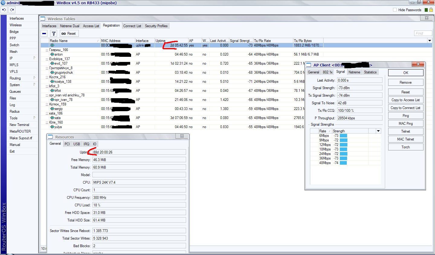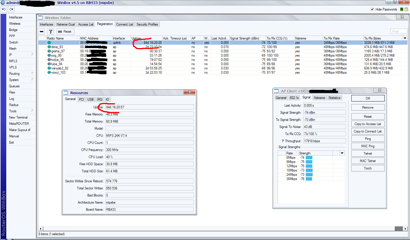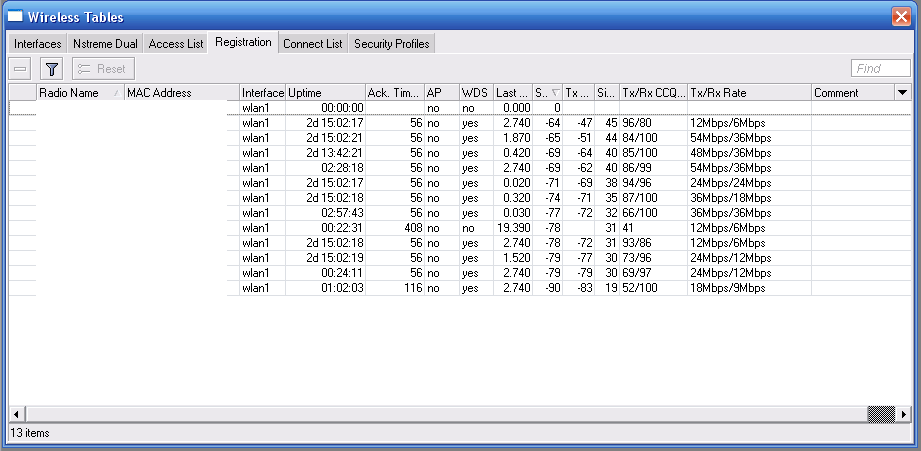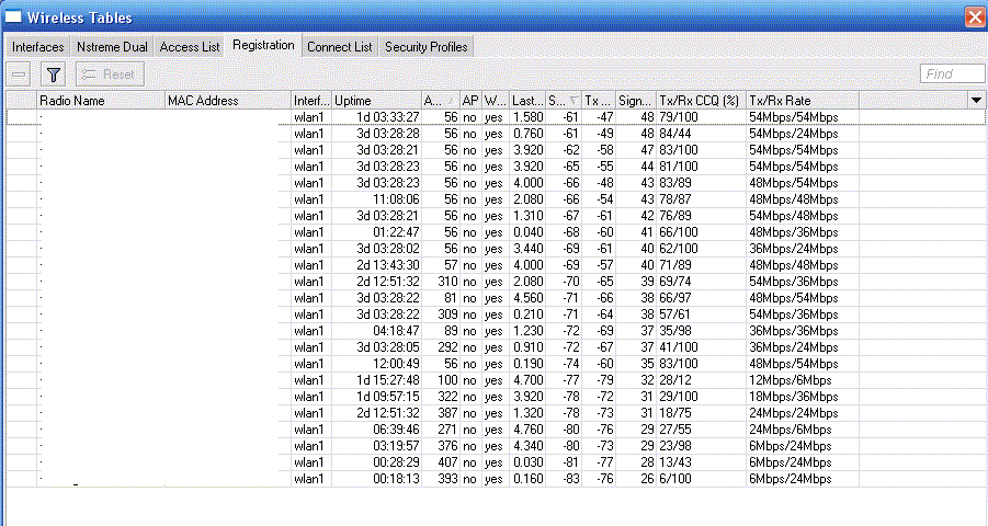Saab95 Posted June 20, 2010 Posted June 20, 2010 (edited) =) ну вы ребята даете. Как может допустим быть CCQ 90-100 если видимость загораживают деревья или еще что? Я же не просто так хвалю их, сам раньше сидел на CM9, а как поменял так понеслось. И у меня очень мало линков где есть прямая видимость, основная масса это пуляние за горизонт, где старые карты без усилков ловили сигналы под -90, а с r52n там заводится на 54 мегабита. Да и что тут говорить, я на них при сигналах -80 подниму линк на 36-48 мегабит и будет работать, можете похвалиться тем же на r52? а уж как они фонят и мешают друг другу даже и говорить не надо=) И с нстримом все работает, на любых расстояниях. Юзаем по одной антенне в N, т.к. 2 в условиях плохой видимости не дают никакой прибавки к скорости. Тем более сейчас 2010 год, наверно на windows 98 никто не сидит, вот эти r52 как раз наподобие ее. Я выложу лучше 2 плохих скрина с r52n - вы на своих r52 так не сможете работать=) потому что когда я ставлю мощу 18дб на передачу - больше половины клиентов пропадают. И один скрин в нстриме похуже. P.S. У карт r52n есть две маааааленькие особенности, разгадав которые вы поймете как сделать стабильными линки на них. Дам маленькую подсказку - на украине работает плохо, а в россии хорошо (ответ тут чисто технического плана, никакой межнациональной вражды). Edited June 20, 2010 by Saab95 Вставить ник Quote