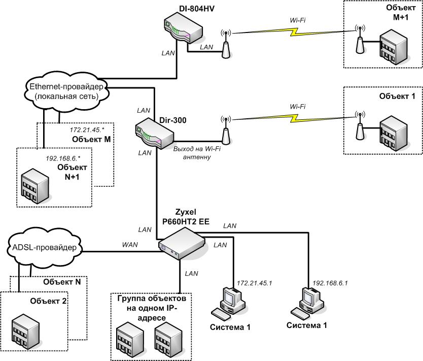 stasus Posted July 27, 2010 Posted July 27, 2010 Добрый день. При переходе на новую работу (занимаемся диспетчерской связью) следующая структура сети диспетчерского узла: 1. 1) К компьютеру подключен ADSL-роутер. 2) К портам ADSL-роутера: телефонный кабель (выход на провайдера ADSL), к LAN-портам: 2 компьютера (2 разных диспетчерских системы), роутер DIR300. 3) К DIR300: в LAN-порт воткнут кабель Ethernet-провайдера (организовал для нас транзитные каналы между объектами) и выведен через WiFi мост на другой объект. На одном компьютере - принимаются сигналы с объектом через ADSL-провайдера и Ethernet-провайдера, на другом - только Ethernet-провайдера (при этом через Ethernet-провайдера прогнаны 2 различных диапазона локальных сетей). Нужна консультация по процессу работы такой сети - как уживаются различные провайдеры в такой структуре и как такая вообще сеть работает? 2. На некоторых объектах организована следующая структура: приходит Ethernet-провайдер на локальный порт DI-804HV, далее в другой LAN-порт заведен WiFi-мост на объект. Я так понимаю, что DI-804HV здесь работает в качестве свитча. Можно ли тут его просто заменить на простой свитч (т.е. установка роутера в данной конфигурации финансово не обосновано)? Спасибо за помощь. P.S. Буду рад даже мааленькой консультации. Вставить ник Quote