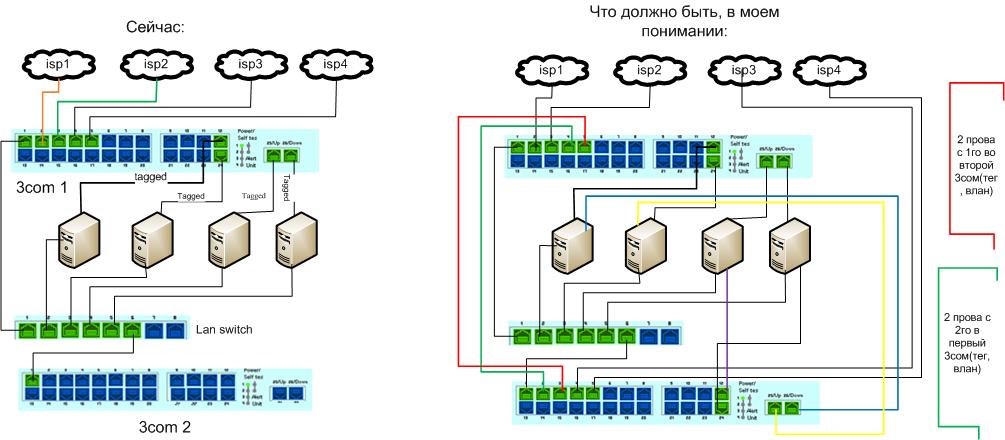 alexandrnew Posted August 18, 2010 Posted August 18, 2010 1 Имеем два одинаковых свитча - 3com 4226T, имеем 4 сервера, у каждого на борту 3 сетевухи, есть 4 провайдера. 2 Для локалки есть гигабитный свитч, каждый сервер в него включен 3 оба 3сома настроены сейчас абсолютно одинаково,но сервера подключены только к одному из них 4 оба 3сома для управления ими включены в локальную сеть (1 порт, дефолтный влан) 5 четыре провайдера включены в 1 3сом в порты 2-5, порты в своих вланах, естественно не тегированые. 6 Сервера подключены в порты 12, 24-26 в 3сом, порты тегированые, по ним сервера получают всех провайдеров. 7 во второй 3сом подключена только локалка, вланы настроены так же. провайдеры не подключены, так как нету столько свитчей, что бы их разделить, думаю надо будет 2 прова в 1 3сом, два в другой, а между 3сомами - провайдеров соиденить вланами (пока оба свитча работают - все норм, при падении - потеряются два прова - не критично) есть задача -сделать 3сомы - High Availability (failover) на случай падения одного из них. для этого есть по оставшейся сетевухе на серверах, сервера - вмваре, т.е. умеют работать с сетевыйми в режимах актив\актив, актив\пасив. Устраивает любой вариант (актив\актив, актив\пасив) Я так понимаю проще всего актив\пасив + RSTP. Вставить ник Quote
