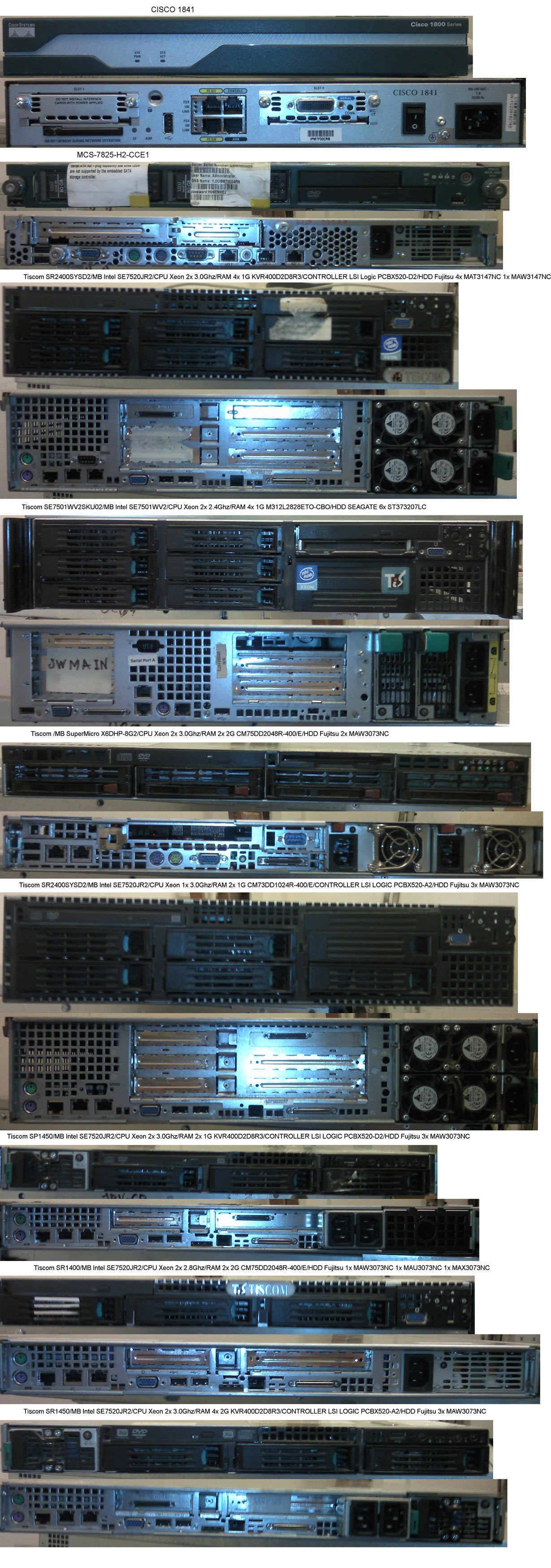 gleb_se Posted August 25, 2010 Posted August 25, 2010 (edited) #Сервера# Tiscom SR2400SYSD2/MB Intel SE7520JR2/CPU Xeon 2x 3.0Ghz/RAM 4x 1G KVR400D2D8R3/CONTROLLER LSI Logic PCBX520-D2/HDD Fujitsu 4x MAT3147NC 1x MAW3147NC Tiscom SE7501WV2SKU02/MB Intel SE7501WV2/CPU Xeon 2x 2.4Ghz/RAM 4x 1G M312L2828ETO-CBO/HDD SEAGATE 6x ST373207LC Tiscom /MB SuperMicro X6DHP-8G2/CPU Xeon 2x 3.0Ghz/RAM 2x 2G CM75DD2048R-400/E/HDD Fujitsu 2x MAW3073NC Tiscom SR2400SYSD2/MB Intel SE7520JR2/CPU Xeon 1x 3.0Ghz/RAM 2x 1G CM73DD1024R-400/E/CONTROLLER LSI LOGIC PCBX520-A2/HDD Fujitsu 3x MAW3073NC Tiscom SP1450/MB Intel SE7520JR2/CPU Xeon 2x 3.0Ghz/RAM 2x 1G KVR400D2D8R3/CONTROLLER LSI LOGIC PCBX520-D2/HDD Fujitsu 3x MAW3073NC Tiscom SR1400/MB Intel SE7520JR2/CPU Xeon 2x 2.8Ghz/RAM 2x 2G CM75DD2048R-400/E/HDD Fujitsu 1x MAW3073NC 1x MAU3073NC 1x MAX3073NC Tiscom SR1450/MB Intel SE7520JR2/CPU Xeon 2x 3.0Ghz/RAM 4x 2G KVR400D2D8R3/CONTROLLER LSI LOGIC PCBX520-A2/HDD Fujitsu 3x MAW3073NC Каждый сервер по 15000 рублей. #Cisco# MCS-7825-H2-CCE1 цена уточняется WS-SVC-FWM-1 с двумя планками памяти SMART SG572644578E63RSH0 168P-SDRAM-512MB-PC133-ECC-REG 200000 рублей WS-X6724-SFP с десятью sfp 1Gb 120000 рублей Пишите на почту gleb.se@gmail.com Edited February 24, 2011 by gleb_se Вставить ник Quote