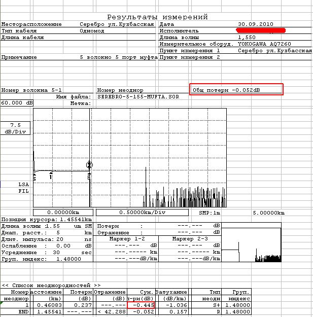 Lecter Posted October 4, 2010 Posted October 4, 2010 Вот есть такая рефлектограмма (см. рис). Вопрос: почему в первой строке результатов на неоднородности (там муфта) в графе "Суммарные потери" (выделено красным квадратом) стоит значение -0.445 dB, следующая строка END -0.052 dB. Общие потери (выделено красным квадратом справа) -0.052 dB. Как может получаться -0.052 dB если уже на первой неоднородности потери -0.445 dB? Не пинайте сильно, измерениями занимаюсь недавно, учусь еще Вставить ник Quote