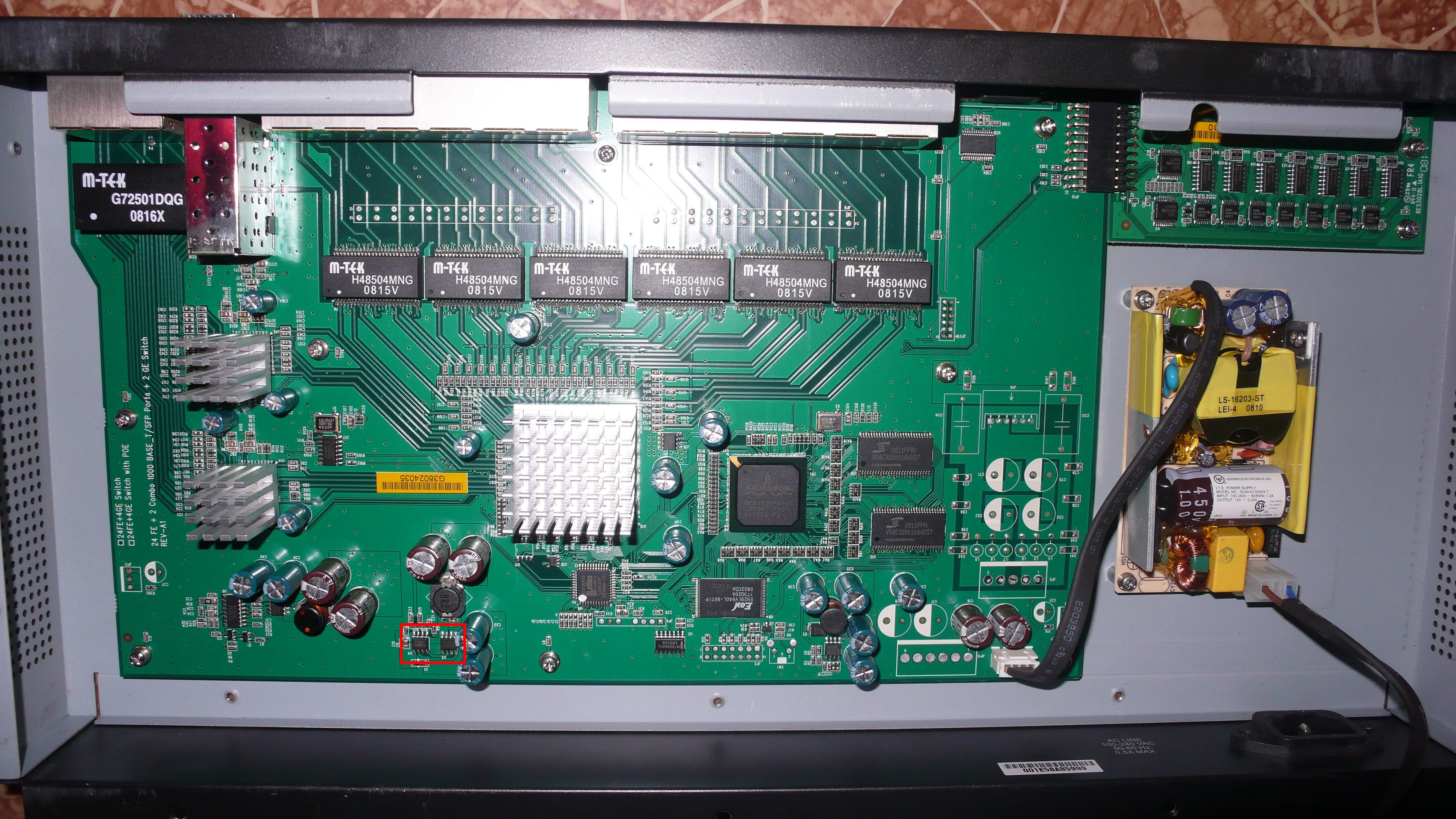 ark_ll Posted October 5, 2010 Posted October 5, 2010 (edited) Ну-с, коллеги. Сочувствую вам. Вот он и настал, тот день, когда ваш любимый, надёжный DES-3028 не захотел загружаться после очередного сбоя питания. Просто светит загадочно всеми индикаторами поочередно и всё тут. Вы уже представляете себе судорожный поиск замены, поездку в сервис и т.д. вы в печали… Со мной была почти та же картина. Только в сервис я не собирался – я знал что мне там скажут «так ваш свич не на гарантии, платите за ремонт, ремонт займет х рабочих дней». Так мне не годится. Попробую-ка я сам… Итак, для начала – симптомы и краткий анализ: - питание вроде как есть - однако свитч явно не грузится - вместо этого - часто моргает светодиодная индикация по всем портам - связи нет никакой, в том числе через консоль Что ж, вскрываем: ЧУдно, видим блок питания, первым делом проверяем его. Для начала обычным тестером меряем напряжение. Тут всё как и положено: DC 12 V. На тестере это отлично видно. Дальше можно предположить , что в этом напряжении имеет место заметная переменная составляющая, которая и не позволяет нормально запуститься процессору и загрузить систему. Вооружаемся осциллографом и проверяем форму напряжения. Как ни странно, переменной составляющей тут нет. Чешем репу, и начинаем пристально рассматривать плату. Особенно элементы на ней. И вот тут обращаем внимание на микросхемки RT9214 и 4914(на фото выделены красным). При ближайшем рассмотрении это оказываются дополнительные тракты питания для гигабитных портов. И это питание контролируется микропрограммой и центральным чипом, а мигание индикации – есть не что иное, как диагностика этого самого питания. И вот эти микросхемы стоят в этих трактах питания. Ну уж тут интернет в помощь. Находим даташиты на микросхемы и разбираемся что к чему. Первый элемент: RT9214 (RICHTEK). По описанию – высокоэффективный драйвер ШИМ-контроллера для цепей вторичного питания логических цепей в компьютерной технике. Оригинал со схемой, а так же даташит ищем здесь http://www.richtek.com/product_detail.jsp?s=318 Второй элемент – просто транзисторная микросборка фирмы Alpha & Omega Semiconductor, Ltd. В составе – два MOSFET-транзистора с диодами Шоттки. Ссылка на документацию: http://www.aosmd.com/web/products/product_...rtnumber=AO4914 Рассматриваем сабж дальше и видим, что схема включения почти не отличается от типовой для RT9214. А раз так, то вооружаемся осциллографом и проверяем сигналы на ножках 2 и 4 RT9214. В моем случае частоты не наблюдалось. Что дало мне основания предположить неисправность ШИМ-контроллера. Для верности, можно еще прозвонить транзисторы на предмет пробоя. Соответственно, не должны прозваниваться накоротко переходы G1-D1, G1-S1, S1-D1, G2-S2, G2-D2, S2-D2 или по ножкам – 2-7, 2-1, 1-7, 4-3, 4-5, 3-5. Если хоть один переход звонится накоротко – сборка меняется целиком. В моём случае помогла замена ШИМ-контроллера RT9214. На плате присутствует еще один ШИМ-контроллер – RT9206 (установлен в цепях питания модулей miniGB IC). Возможно, в вашем случае неисправным окажется именно он. Проверяется он аналогично (контрольные ножки - 12 и 14). Ссылка на документацию: http://www.richtek.com/product_detail.jsp?s=316 Edited October 5, 2010 by ark_ll Вставить ник Quote