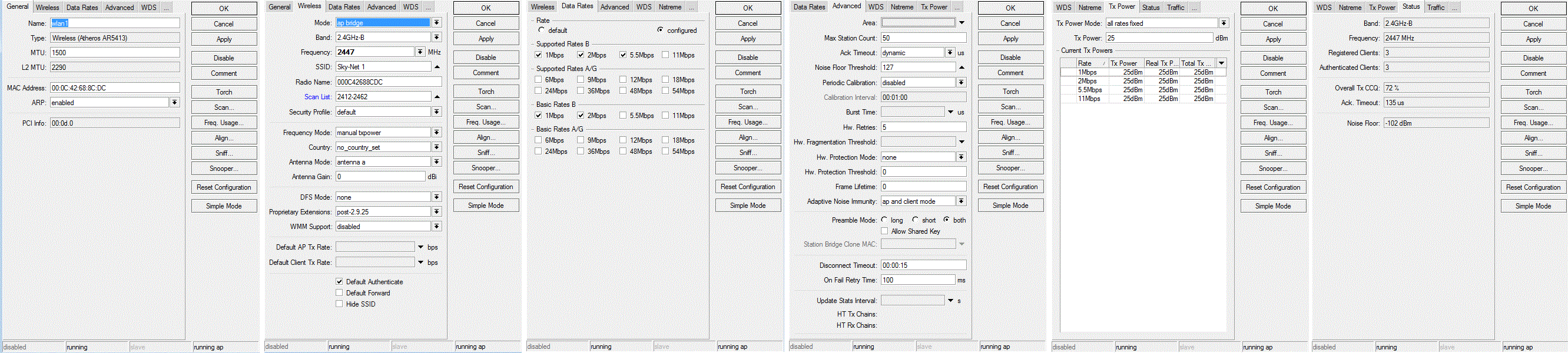 SSD Posted October 18, 2010 Posted October 18, 2010 Скрин со списком подключеных клиентов покажите. Почему используется Б стандарт, и не включенно 11 Мбит? У Вас скорости наверное никакие. Что стоит у клиентов? На 802,11b данные карты имеют максимальную выходную мощность и чувствительность. У клиентов зоопарк, начиная от "айпадо" до юриков у которых еще своя беспроводная сеть внутри здания с несколькими зонами. Скорость большая ненужна нафиг, самый широкий канал в интернет - 512килобит (очень дорогой инет у нас, очень, такой канал стоит 30 000) Локалка не предусматривается естественно. Поэтому скорость неважна - важна стабильность, очень важна. А что 802,11b это плохо? С зоопарком клиентов, никой стабильности Вы неполучите. Клиенты со всякими айпадами\лаптопами при подключении ухудшают скорость и качество всем остальным. Разделяйте клиентов по секторам, юриков в один физиков в другой. Добейтесь того чтобы у всех клиентов сигналы были одинаковыми плюс-минус пара дБм. Вставить ник Quote