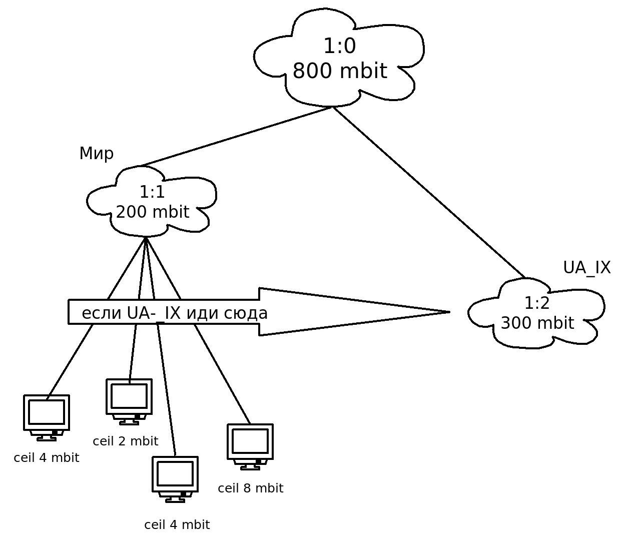 Nallien Posted October 27, 2010 Author Posted October 27, 2010 (edited) а задача немного другая - что бы конкретный абонент с rate 10 имел пусть и два подкласа, но что бы унего в обоих этих подкласах был ceil 10, хотя возможно я еще не совсем врубился что вы имеете в виду... но в любом же случае сверху нужно ограничивать, ибо если этого не делать - то скорость не будет правильно делиться между абонентами и будет забивать внешний канал. может я чего не понимаю - распишу как вижу. если все абоненты будут иметь в парентах 1:0, как описать этот 1:0? логичным представляется как указываем локальной скорости - тобишь 800 мбит. но в таком случае если все кинуться качать с зарубежки, оч быстро забьют 200 мбит, так как шейпер буде считать что таем всего 800 мбит, тобишь еще 600 свободно. если 1:0 описать как 500 мбит (суммарная скорость) - будет точно так же. если описать как 200 мбит - не будет использоваться реальная пропускная способность канала. а без правильного описания 1:0 - шейпер вообще не сможет нормально работать.... поправьте если не прав. Edited October 27, 2010 by Nallien Вставить ник Quote