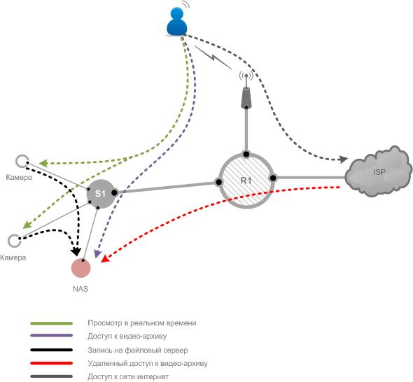 garmonik Posted November 16, 2010 Author Posted November 16, 2010 Приехал клиент из командировки, съездили на место, еще раз все посмотрели, в результате делаем проводное видеонаблюдение. Изменилась схема сети, теперь сеть видеонаблюдения должна подключаться к сети Интернет. Возле дома есть техническое помещение, в нем будет распологаться шкаф с оборудованием. Доступ к камерам, к архивам видео и к сети Интернет будет осуществляться через ТД. Не могу понять, каккой функционал коммутатора нужен для IP-камер? Надо ли использовать умные свитчи или будет достаточно простого неуправляемого коммутатора? А то я тут думал может каждую камеру в отдельный VLAN, закрепить MACи за конкретными портоми, создать статические arp-таблицы, сделать привязки MAC+IP, ограничить управление ACLми и терминировать VLANы на какой-нибудь простенький агрегат. Предпологаемое движение трафика. Вставить ник Quote