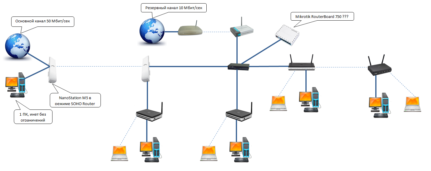 WhyMax Posted November 7, 2010 Posted November 7, 2010 (edited) Помогите пожалуйста выбрать роутер, который сможет распределить канал 50 Мбит между 15 абонентами. В данный момент все подключено как на схеме: Все роутеры работают как обычные свитчи (все кабели подключен в LAN порты, порт WAN пустой). Интернет раздает наностания, которая работает в режиме SOHO роутера. Хочу поставить какой-нибудь роутер, чтобы можно было ограничить доступ в интернет по MAC адресам, а так же чтобы он делил канал между пользователями (урезал скорость качальщикам и т.д.). Можно же будет заблокировать доступ в инет на наностанции всем компам, кроме роутера и компу, который напрямую подключен к наностанции, а роутер уже будет раздавать всем интернет? Так же интересует автоматическое переключение на резервный канал в случае отказа основного. Подойдет ли для этих целей Mikrotik RouterBoard 750? Может быть посоветуете что-нибудь еще? Edited November 7, 2010 by WhyMax Вставить ник Quote