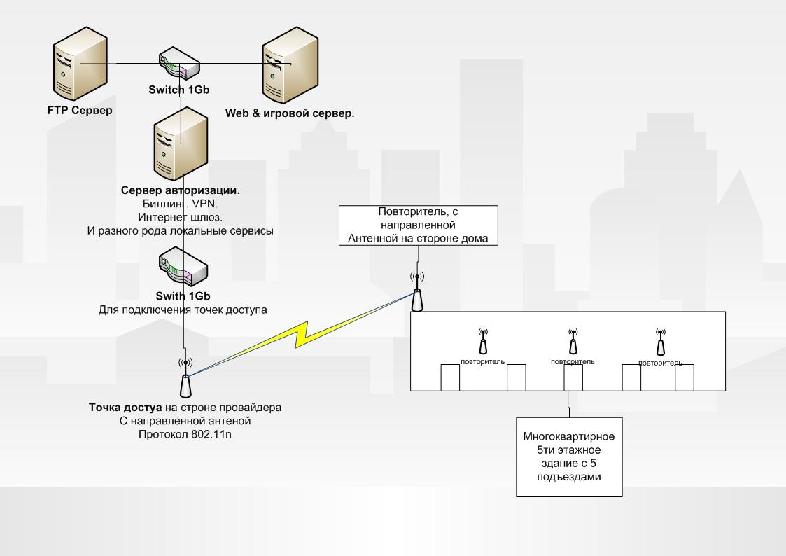 basnik Posted November 13, 2010 Posted November 13, 2010 (edited) Доброго времени, уважаемые профессионалы. Прошу помочь в решении ряда вопросов, с которыми столкнулся при проектировании собсно сабжа. Имеется сильное желание покрыть wi-fi сетью порядка 3-5кв км небольшого городка. Местность, в основном 5-этажки. Ориентируюсь на ~1000 пользователей, с возможностью расширения. Хотелось бы сделать все это по уму, красиво, стабильно и с максимальной отдачей. Хоть и понимаю что в случае с Wi-Fi много но. Опыта в организации сетей такого масштаба я не имею.. да, пожалуй, вообще никакого не имею, но попробовать хочется) И чтобы свести к минимуму возможные подводные камни и сделать все сразу максимально правильно, обращаюсь к вам. Начнем пожалуй с общей картины: Сеть планируется использовать для: 1. Доступа в интернет (обязательна поддержка p2p, vpn, желательна VoIP) 2. Доступа к локальным ресурсам. 3. Организации общей локальной сети между пользователями. (с возможностью обмена файлами, игры в сетевые игры и тд) Требования от сети: 1. Безопасность (хотя бы опциональная) 2. Скорость для каждого пользователя ~10Mbit 3. Стабильность & возможность быстро устранить ту или иную неисправность. 4. Биллинг. Возможность учета и тарификации пользователей. 5. Все услуги, доступ во внутреннюю сеть, интернет, локальные ресурсы и т.д осуществляются только после авторизации пользователя сервером. Пользоваться сетью будут не только пк, но и иные ус-ва с WLAN ф-цией (телефоны, psp и т.д). При этом необходимо максимально контролировать все подключения, для тарификации и распределения нагрузки. Бюджет порядка 100т.р на серверное оборудование и 10-20к руб. на каждый дом (5ти этажный 5 подъездов). Перерыл много инфы, прежде чем написать, но полную картину так и не смог представить(. На данный момент представляю это как то так: http://savepic.net/181862.jpg В качесте FTP сервера - стандартная серверная машинка с посаженным на SAS диском. В качестве Web-сервера - обычный компьютер В роли сервера-авторизации - сервер/пк. Но видимо все же сервер, учитывая возможную нагрузку. Точки доступа - хз, смотрел железки стандарта 802.11n, приглянулись скоростью (300 Mb/s) и ценой. Повторители, хочется использовать именно повторители, чтобы был единый ssid а не куча разных и пользователь мог перемещаться от одного повторителя к другому без разрыва соединения, ведь оно, в таком случае, не разорвется, верно? Собственно возникшие вопросы/проблемы: FTP сервер. Довольно бодрая машинка со скоростью чтения 150МБайт+, но вот засада, скорость ограничивается 1Gb каналом, поскольку весь трафик идет через сервер авторизации, и это если учесть что web-серевер не задействован. Можно, конечно, подключить напрямую к свичу, но тогда весь трафик будет идти в обход биллинга, и любой желающий, даже пройдя авторизацию сможет получить к нему доступ, что не есть хорошо. Опять же, ни что не мешает сделать доступ к FTP по паролю, который тащить с биллинг сервера, но как то криво, каждую ссесию авторизироваться(. Тут больше проблема именно в связке, потому как ftp находится за билингом. Об этом дальше. Сервер авторизации он же биллинг, VPN сервер, интернет шлюз. Дабы обезопасить пользователей от любителей снифать трафик, необходимо дать возможность использовать VPN, но, не в обязательном порядке (ибо далеко не все ус-ва его поддерживают, да и в ряде случаем он попросту не нужен). От биллинг системы требуется считать то