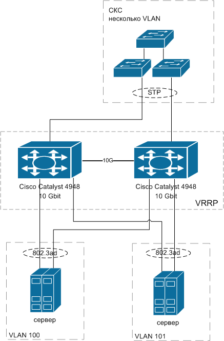 msdt Posted November 24, 2010 Posted November 24, 2010 (edited) Покритикуйте, пожалуйста, схему. Требуется построить отказустойчивое ядро сети для большого офисного здания и центра обработки данных с некоторым количеством серверов. Сеть будет разбита на вланы по подсетям, маршрутизация между вланами будет на двух Cisco Catalyst 4948 10 Gbit, соединенных десятигигабитным линком и объединенных с помощью VRRP. Сервера будут подключаться двумя гигабитными линками, по одному к каждому каталисту, и агрегированным с помощью 802.3ad. Коммутаторы СКС (скорее всего каталисты 29XX или 35XX) будут соединены в кольцо с включенным STP, концы которого также будет замыкаться на 4948. В СКС может быть несколько вланов. Серверы также будут в разных вланах. Возможна ли такая схема? Подходящее ли оборудование выбрано? Может ли работать link aggregation с концами на разных коммутаторах? Можно ли совместно использовать VRRP и link aggregation / STP? Я вполне могу чего-то не понимать, т.к. в основном имел дело с сетями на основе дэлинков, в которых не было ничего сложнее VLAN и STP. Но потребовалось реализовать крупный проект и появились вопросы... Edited November 24, 2010 by msdt Вставить ник Quote