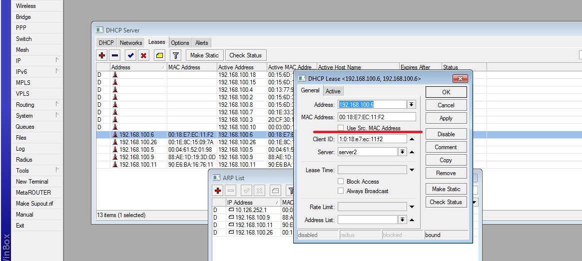 porozut Posted December 10, 2010 Author Posted December 10, 2010 А тогда что делает галочка указанная на скрине в первом посте?Галочка позволяет при создании привязки не вводить MAC вручную,а использовать тот MAC, который используется клиентом в данный момент. Огромное спс именно это и хотел услышать. Благодарю за помощь. Вставить ник Quote