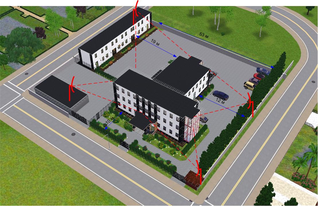 SSD Posted December 11, 2010 Posted December 11, 2010 Подскажите какие выбрать антенны, что бы обеспечить вайфаем все три здания на рисунке. Клиенты будут с ноутбуками. Нужно ли 4 антенны или может хватить двух антенн которые справа. mikrotik 411AH+r52H Внутри здания стены очень толстые и противопожарные двери, если ставить точки в коридоре то сигнал очень слабый. А на улице хоть через окна можно достучаться. Понаставьте внутри зданий дешевых ТД и свяжить их кабелем. Так будет гораздо лучше. Вставить ник Quote