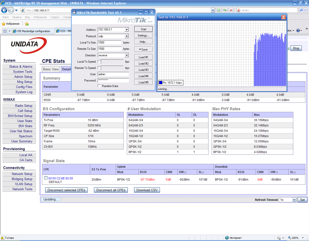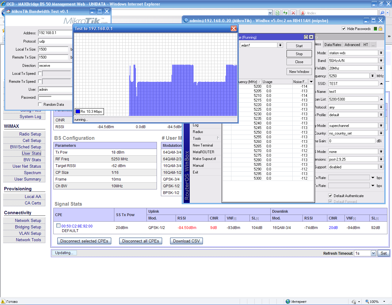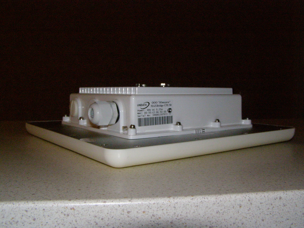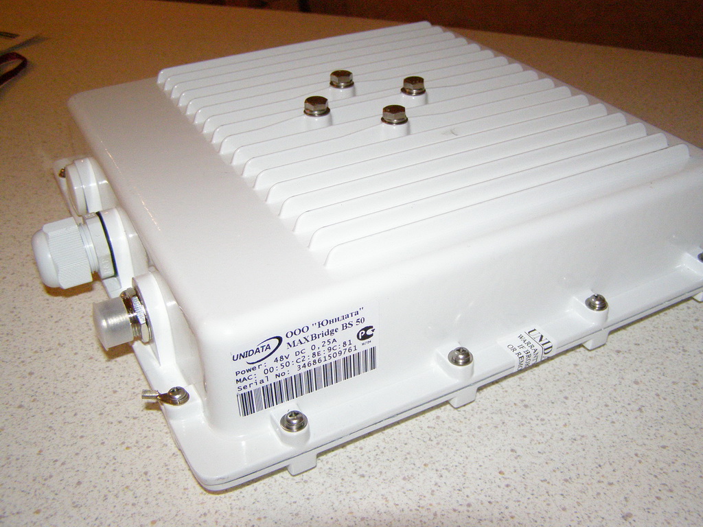 Saab95 Posted December 11, 2010 Posted December 11, 2010 Получили оборудование WiMax MAXBridge BS 50, клиента под внешнюю антенну MAXBridge CPE 50 и клиента со встроенной антенной, который так же называется MAXBridge CPE 50. Базовая станция MAXBridge BS 50 стандарта IEEE WirelessMAN 802.16 предназначена для построения фиксированных WiMAX сетей широкополосного беспроводного доступа в диапазоне частот 5150-5350, 5470-5850 МГц. Более подробно ознакомится с характеристиками и описанием можно на официальном сайте по адресу: http://www.unidata.com.ua/index.php?lang=rus Для тех, кто знает английский можете просто http://www.unidata.com.ua Но там в основном описание для специалистов, нам же интересно все потрогать руками, так что приступим. Упаковано все в аккуратные коробочки, сначала рассмотрим базовую станцию MaxBridge BS 50: Внешний вид коробки. MaxBridge BS 50 и комплектующие аккуратно сложено внутри. Наклейка с наименованием и серийным номером, так же видна гарантийная наклейка, которую очень легко повредить. Разъем под антенну и вход для витой пары - спрятан под гермовводом. Вид с другой стороны, выпуклый немного корпус MaxBridge BS 50 издали походит на встроенную антенну. Вот из чего состоит гермоввод, можно вставить уже обжатый кабель - очень удобно. Даже если нарушить герметичность прокладок вода внутри не наделает бед, если и попадет внутрь - тут же вытечет обратно. Очень хотелось заглянуть внутрь=) Это комплектация устройства MaxBridge BS 50. Сама базовая станция, блок питания на 48 вольт, кабель к нему, крепеж и болтики. Загогулину в форме восьмерки на базу лучше не ставить - как я понял это для клиентских устройств со встроенной антенной, чтобы направлять ее во всех плоскостях на базовую станцию. Теперь клиентское оборудование: Внешний вид коробки. Внутри все так же аккуратно. Внешний вид - по размеру меньше чем базовая станция. В комплект входит так же все необходимое для монтажа. Теперь самое интересное - клиент со встроенной антенной. Однако на коробке нигде про это не написано - легко перепутать. Коробка снова большая. Теперь понятно почему - ведь встроенная антенна несколько больше корпуса устройства. Гермоввод для витой пары в другом месте. Антенна. Вид с боку. Комплектация все та же, тут как раз и пригодится эта железная восьмерка - с ее помощью можно направить антенну под нужными углами на базовую станцию. Собрал вот такой тестовый стенд. На базу MAXBridge BS 50 накрутил круговую антенну, а клиентское устройство со встроенной унес в соседнюю комнату и расположил так, чтобы стены как можно больше перегораживали прямую видимость между устройствами. Рядом с базой разместил 2 микротика, чтобы посмотреть что и как работает. Вставить ник Quote