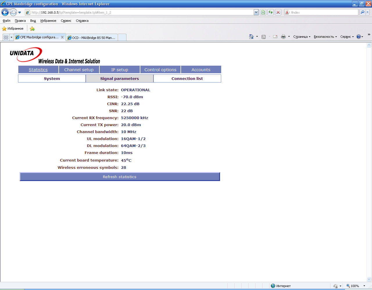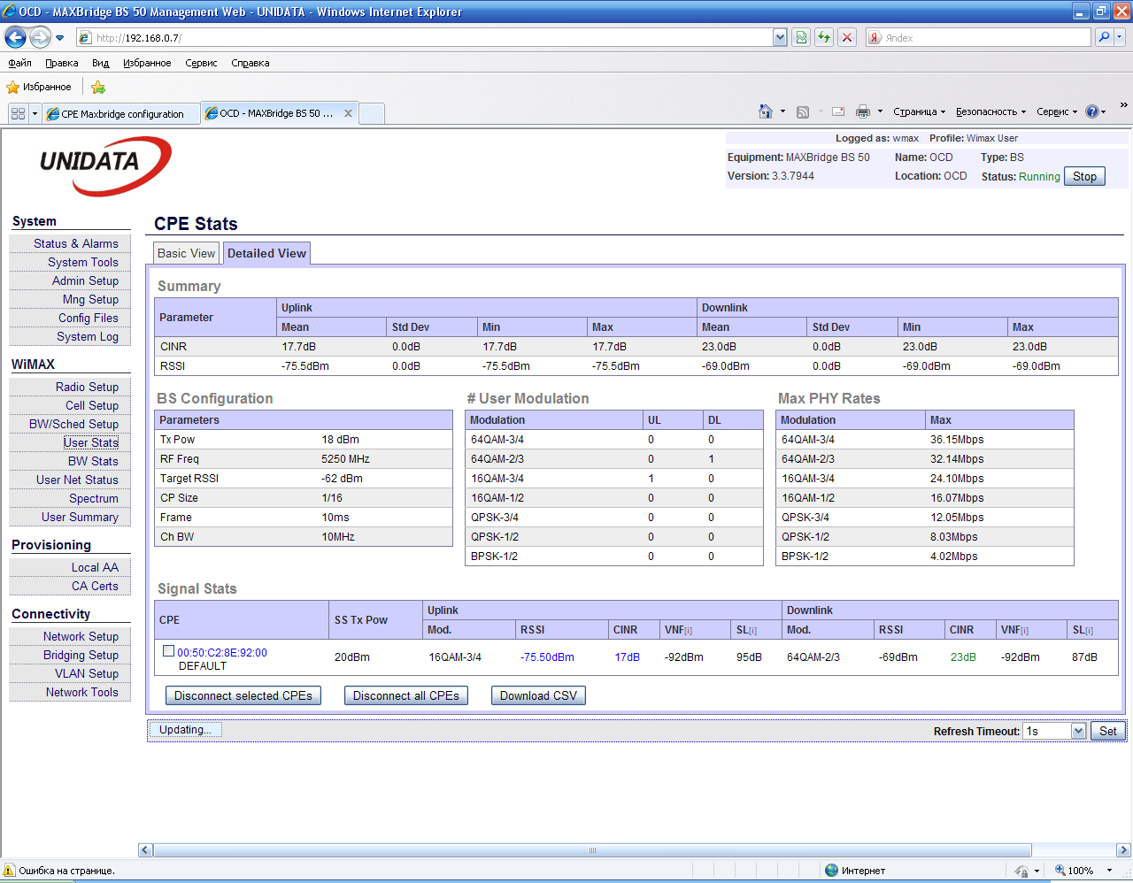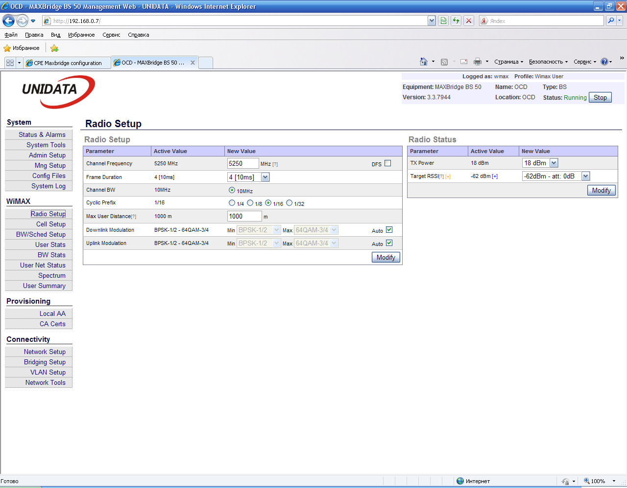 Saab95 Posted December 11, 2010 Posted December 11, 2010 Получили оборудование WiMax MAXBridge BS 50, клиента под внешнюю антенну MAXBridge CPE 50 и клиента со встроенной антенной, который так же называется MAXBridge CPE 50. Базовая станция MAXBridge BS 50 стандарта IEEE WirelessMAN 802.16 предназначена для построения фиксированных WiMAX сетей широкополосного беспроводного доступа в диапазоне частот 5150-5350, 5470-5850 МГц. Более подробно ознакомится с характеристиками и описанием можно на официальном сайте по адресу: http://www.unidata.com.ua/index.php?lang=rus Для тех, кто знает английский можете просто http://www.unidata.com.ua Но там в основном описание для специалистов, нам же интересно все потрогать руками, так что приступим. Упаковано все в аккуратные коробочки, сначала рассмотрим базовую станцию MaxBridge BS 50: Внешний вид коробки. MaxBridge BS 50 и комплектующие аккуратно сложено внутри. Наклейка с наименованием и серийным номером, так же видна гарантийная наклейка, которую очень легко повредить. Разъем под антенну и вход для витой пары - спрятан под гермовводом. Вид с другой стороны, выпуклый немного корпус MaxBridge BS 50 издали походит на встроенную антенну. Вот из чего состоит гермоввод, можно вставить уже обжатый кабель - очень удобно. Даже если нарушить герметичность прокладок вода внутри не наделает бед, если и попадет внутрь - тут же вытечет обратно. Очень хотелось заглянуть внутрь=) Это комплектация устройства MaxBridge BS 50. Сама базовая станция, блок питания на 48 вольт, кабель к нему, крепеж и болтики. Загогулину в форме восьмерки на базу лучше не ставить - как я понял это для клиентских устройств со встроенной антенной, чтобы направлять ее во всех плоскостях на базовую станцию. Теперь клиентское оборудование: Внешний вид коробки. Внутри все так же аккуратно. Внешний вид - по размеру меньше чем базовая станция. В комплект входит так же все необходимое для монтажа. Теперь самое интересное - клиент со встроенной антенной. Однако на коробке нигде про это не написано - легко перепутать. Коробка снова большая. Теперь понятно почему - ведь встроенная антенна несколько больше корпуса устройства. Гермоввод для витой пары в другом месте. Антенна. Вид с боку. Комплектация все та же, тут как раз и пригодится эта железная восьмерка - с ее помощью можно направить антенну под нужными углами на базовую станцию. Собрал вот такой тестовый стенд. На базу MAXBridge BS 50 накрутил круговую антенну, а клиентское устройство со встроенной унес в соседнюю комнату и расположил так, чтобы стены как можно больше перегораживали прямую видимость между устройствами. Рядом с базой разместил 2 микротика, чтобы посмотреть что и как работает. Вставить ник Quote