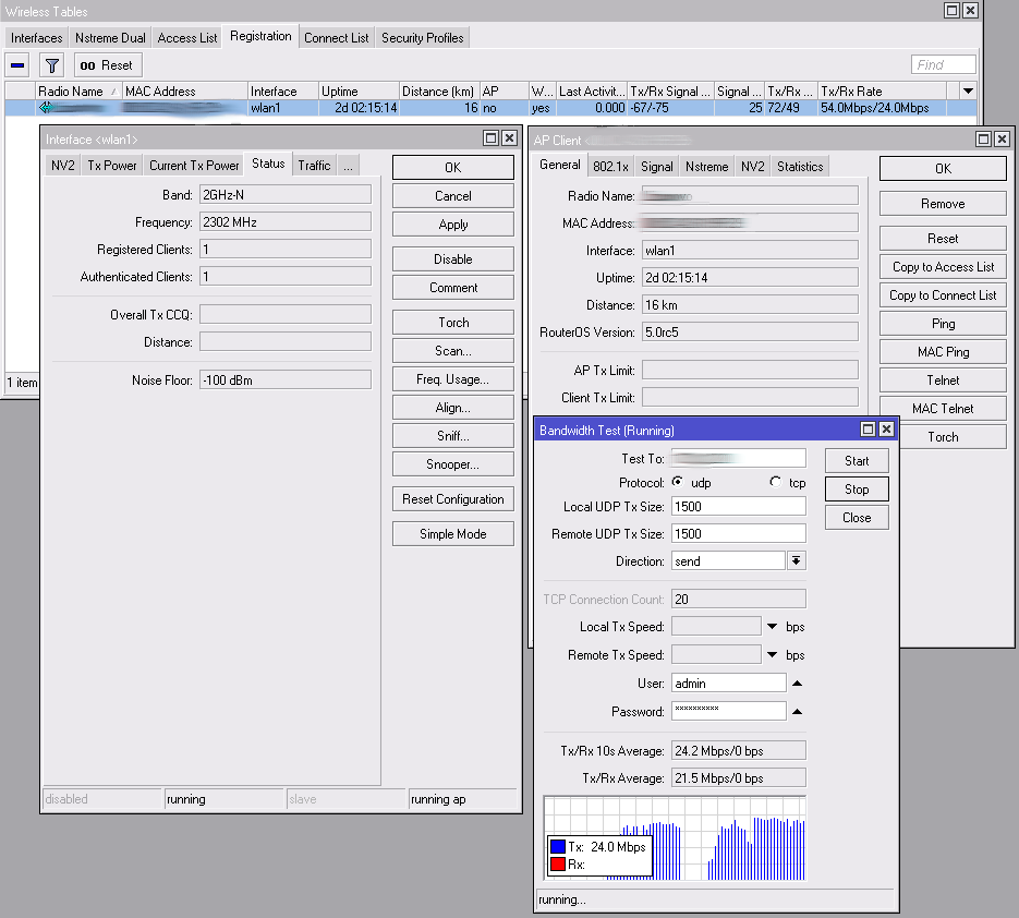 Saab95 Posted December 18, 2010 Posted December 18, 2010 Купите блин параболическую антенну, вот такую http://asp24.ru/antenna/antenny-24-ggc/antenna-24-asp-24/ и не страдайте мазохизмом. Сейчас огромнейший выбор различных антенн, за разумные деньги. Покупать облучатель под тарелку - глупо. Одно дело вам надо прокинуть линк в мимо на 20км, тогда да - облучатель двухполяризационный на 5ггц будет выгоднее, или там нанос в фокус тарелки поставить. Но обычный линк в одном канале на 2.4 ггц запихивать в тарелку, да еще за те же деньги что стоит уже готовый параболик не стоит. выбор в сторону излучателя был изза более узкой диаграммы направленности и большей мощности на 90см тарелкахданная антенна будет работать на 2312 мегагерц? и хватит ли 24 дб на 7-8км ? У облучателя в тазике диаграмма направленности будет хуже. Вот вам для примера, линк на 16 километров, с 2-х сторон 24дб параболики, частота 2302, сигналы -67/-75 (с той стороны антенна низко расположена, поэтому и сигнал на прием от клиента хуже), прокачка 24 мегабита. Смотрите картинку. Вставить ник Quote