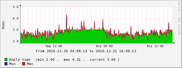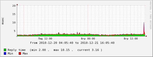 Tima Posted December 21, 2010 Posted December 21, 2010 В последнее время клиенты стали частенько жаловаться на то, что вечером невозможно пользоваться интернетом. Решил посмотреть, что происходит с тремя более-менее популярными ресурсами в течение суток: nag.ru, linux.org.ru и overclockers.ru. В результате обнаружил интересную закономерность - пинг до этих ресурсов одинаково проседает примерно в 16:00 и в таком состоянии держится до 0:00. ... А что, если пинг до ресурса с 13мс "просел" до 18ти, то уже им невозможно пользоваться? Вставить ник Quote
