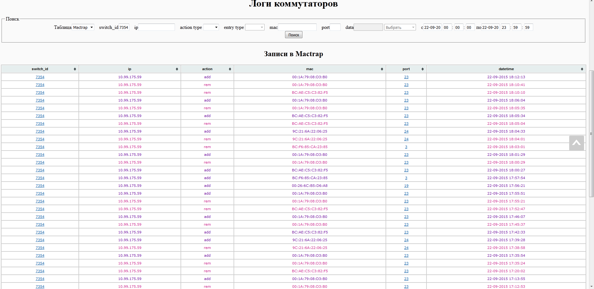 xcme Posted September 22, 2015 Posted September 22, 2015 (edited) А что значит "всё" сливается? В смысле сислог и мак-нотифи с DES-3028/DES-3200-28. Но сюда валяться link up/down (при чём бывает в большом количестве каждую секунду) Это надо чинить, залипший порт скорее всего. Сислог и помогает их найти. Можно настроить сислог так, чтобы пилил логи от длинков подевайсно, то есть на каждый коммутатор - свой лог файл. Очень медленный поиск будет. В MySQL пихал, тоже потом стало тормозить. Объем данных очень большой. Потом на оракле сделали базу. Что уж там они крутили и какую конфу собрали не знаю, но работает реально быстро. На скриншотах интерфейс поиска для ТП. Можно разные поля задавать и фильтровать поиск. Поднимать что-то другое типа syslog-ng ? Если интересны мои велосипеды, то я планировал своего демона выложить на гитхаб до конца года. В блоге лежит старое решение под винду, но тоже работает. Можно побаловаться, поставить для теста. p.s. Интерфейс в комплект не входит. :) Edited September 22, 2015 by xcme Вставить ник Quote