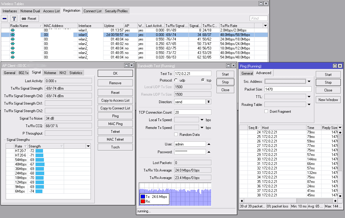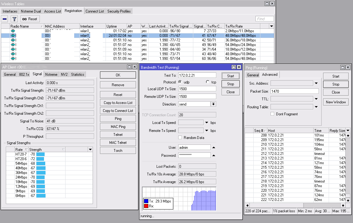Saab95 Posted March 14, 2011 Posted March 14, 2011 А вот такую не хотите ? - http://wifilab.ru/catalogue/tovar.php?id=1357 Стоят на расстоянии где-то 5-7 метров друг от друга, повернутые зад к заду, видят друг друга с уровнями -72. Вот прокачка с них, в TCP (24) и UDP (29), пинги 1470 при TCP тесте выше 144 не поднимаются, в UDP есть потери. С другой стороны параболик на 27дб. Висит на высокой березе на мачте, качается вместе с деревом=) Поэтому сигналы так плавают. В борде RB433 установлены 3 карточки, поэтому такие низкие показатели. Вставить ник Quote