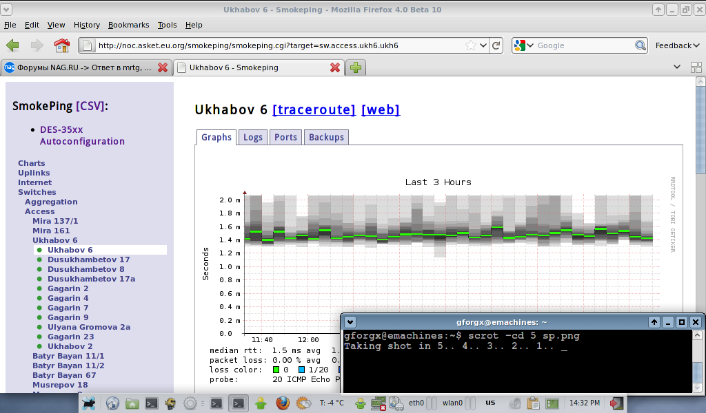 GFORGX Posted March 17, 2011 Author Posted March 17, 2011 Нет конечно, я имел ввиду что съем данных по SNMP не нагибает коммутаторы. А уж просмотр, заббикс например.Опять же все от задачи зависит. Если один, два, три коммутатора, то нет смысла городить что-то большее. Коммутаторов - около 300, а прикрутить планируется к уже и без того пиленному Smokeping (складывание в БД, кружочки с текущим состоянием и audio-тэги в листинге, просмотр логов из Syslog, ещё всякое), сейчас выглядит как-то так: Вставить ник Quote