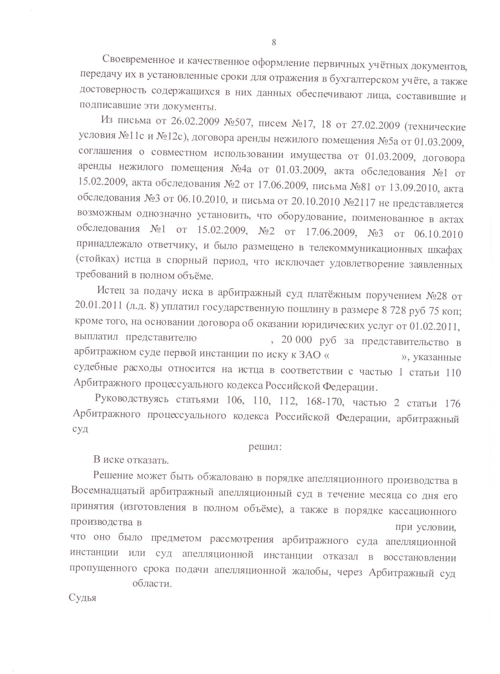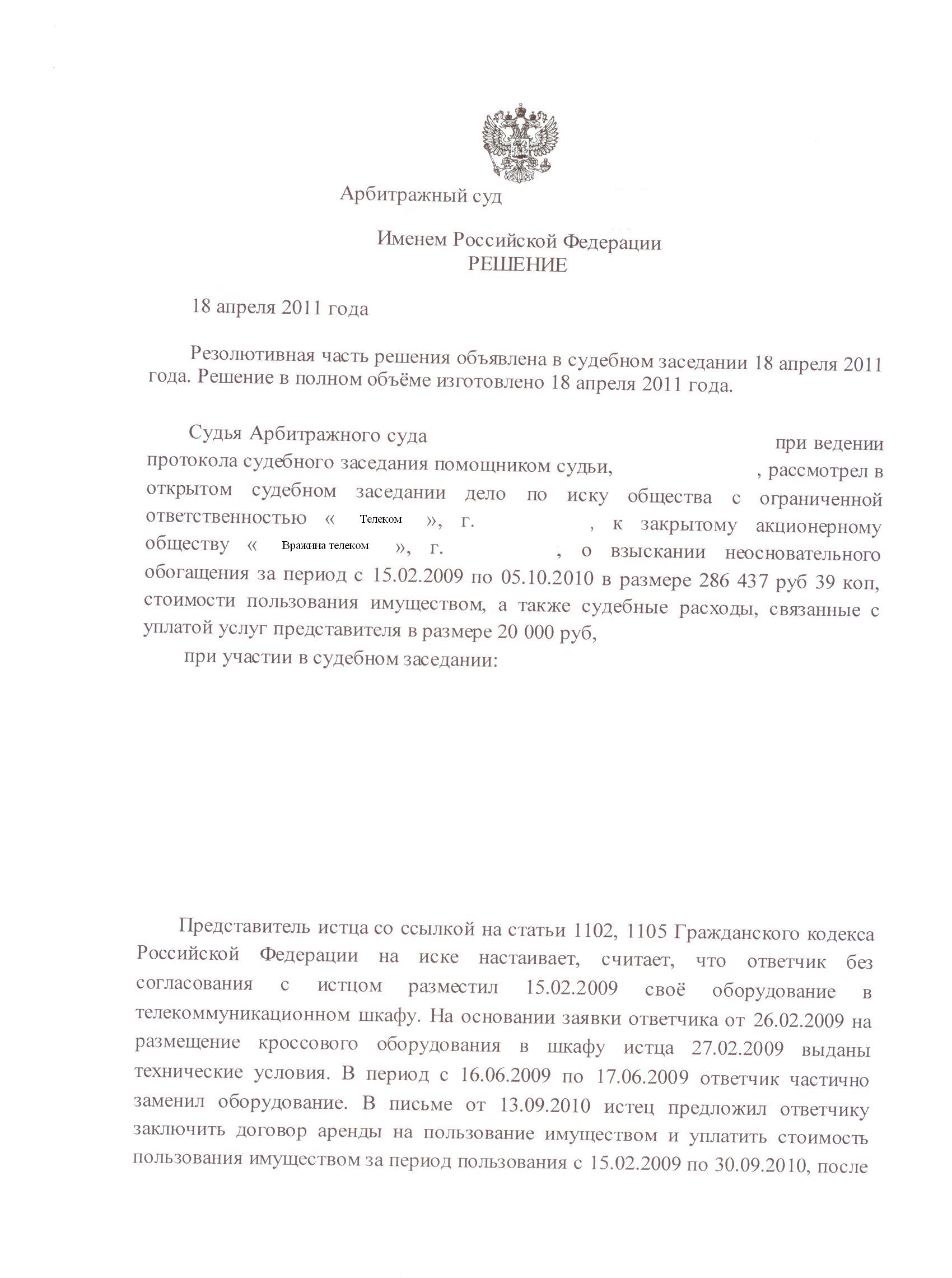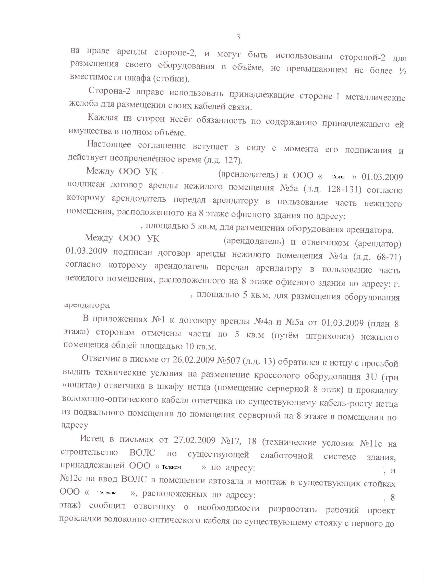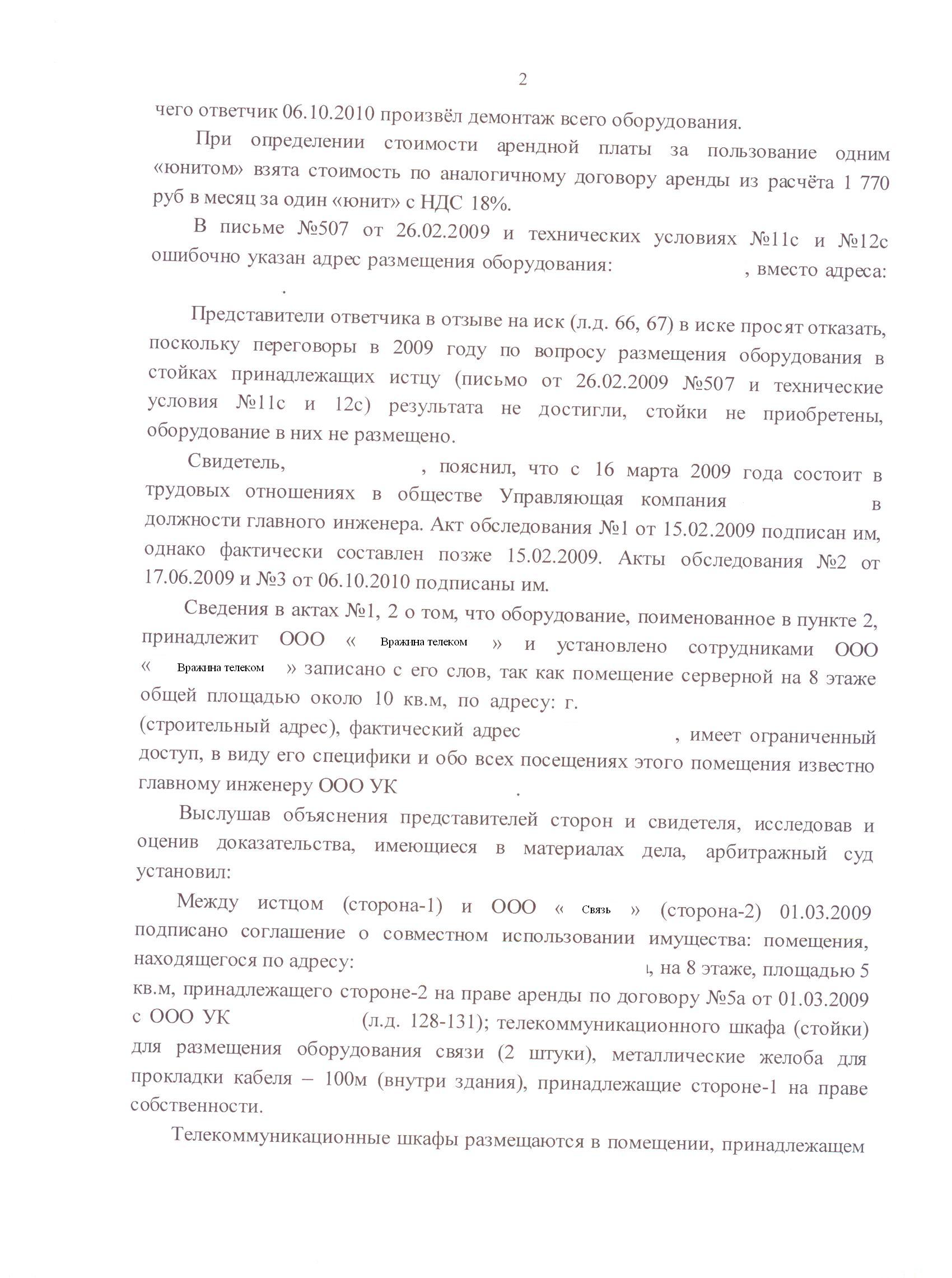Сутяжник Posted April 26, 2011 Posted April 26, 2011 Добрый день! Имеется следующая ситуация, Провайдер 1 назовём его ООО "Телеком" построил в здании Бизнес центра (20 этажей) инфраструктуру в виде а) Кабельной шахты от подвала до верхнего этажа. б) 19" Стоек на 3,5,8,11,14,18 этажах в) СКС на этажах с кроссировкой в одной из стоек пункта Б. Все работы выполнял сторонний подрядчик. Далее провайдер 2 назовём его "Вражина телеком" по предварительной устной договорённости с нам (ООО "Телеком") разместил свой кабель в нашей кабельной шахте здания от подвала до 8го этажа, а так же разместил оборудование в нашей стойке на 8 этаже, в виде кросса оптического, свитча, голосового шлюза, в последствии обязавшись эту стойку выкупить себе в собственность. Нами было направленно письмо Вражине телеком о необходимости получения ТУ на размещения кабеля и оборудования. ТУ были нами сделаны, и переданы Вражине. Далее по какой причине вражина телеком отказывается покупать стойку, но продолжает размещать в ней своё оборудование в количестве 13 юнитов. Мы пишем претензию о том что ТУ не оплачены и не выполнены, а так же требуем оплатить аренду места в нашей стоке по тарифам оператора ООО "Вражина телеком" (мы так же размещаем своё оборудование у них) так как стойку они оплатить отказались, а место занимают. Мы составляем с собственником здания (управляющей компанией) акт о размещении имущества Вражины в нашей стойке, на составление акта представители вражины не приглашались. Акт подписали наш Тех. директор, и гл. инженер УК. В ответ вражина телеком сокращает кол-во оборудования в нашей стойке до необходимого им минимума, но продолжает занимать 7 юнитов. Мы составляем с собственником здания (управляющей компанией) акт о фиксировании изменения в размещении имущества Вражины в нашей стойке что теперь там не 13 юнитов а 7, в акте указан весь перечень оборудования, на составление акта представители вражины не приглашались. Акт подписали наш Тех. директор, и гл. инженер УК. Далее мы опять пишем письмо о том что если нам не оплатят аренду, то мы вынуждены будем демонтировать их оборудование из своей собственности. В ответ они пишут нам письмо что никакого оборудования они у нас не размешали никогда, и ночью пока никто не видит перетаскивают из нашей стойки своё имущество в свою вновь установленную стойку (у них есть договор с УК о аренде части помещения где стоят стойки). Мы составляем с собственником здания (управляющей компанией) акт о фиксировании изменения в размещении имущества Вражины в нашей стойке что теперь там не 7 юнитов а 0, на составление акта представители вражины не приглашались. Акт подписали наш Тех. директор, и гл. инженер УК. В итоге у нас получается ситуация что они используют нашу кабельную шахту, нашу инфраструктуру (СКС) для оказания услуг связи арендаторам, но отказываются оплачивать размещение оборудования в кабельной шахте, и в стойках за два года. Далее мы подали иск в арбитражный суд. Там предоставили все акты, вызвали свидетелем гл. инженера УК, который всё подтвердил, но суд первой инстанции в иске отказал. Собственно вопрос помогите советом как правильно обжаловать в касации, ибо решение не справедливое. Прилагаю решение суда первой инстанции. С уважением, заранее спасибо. Вставить ник Quote