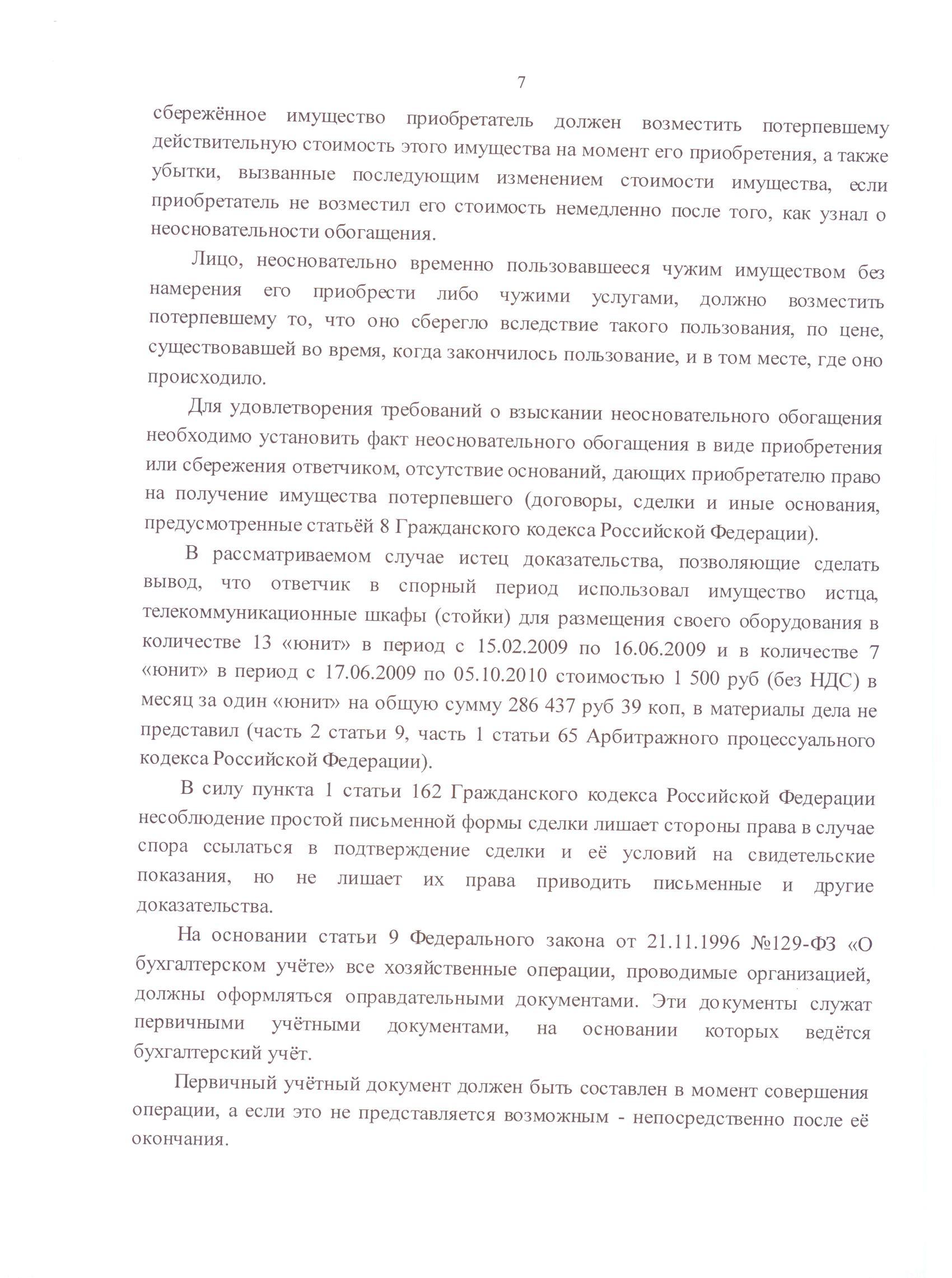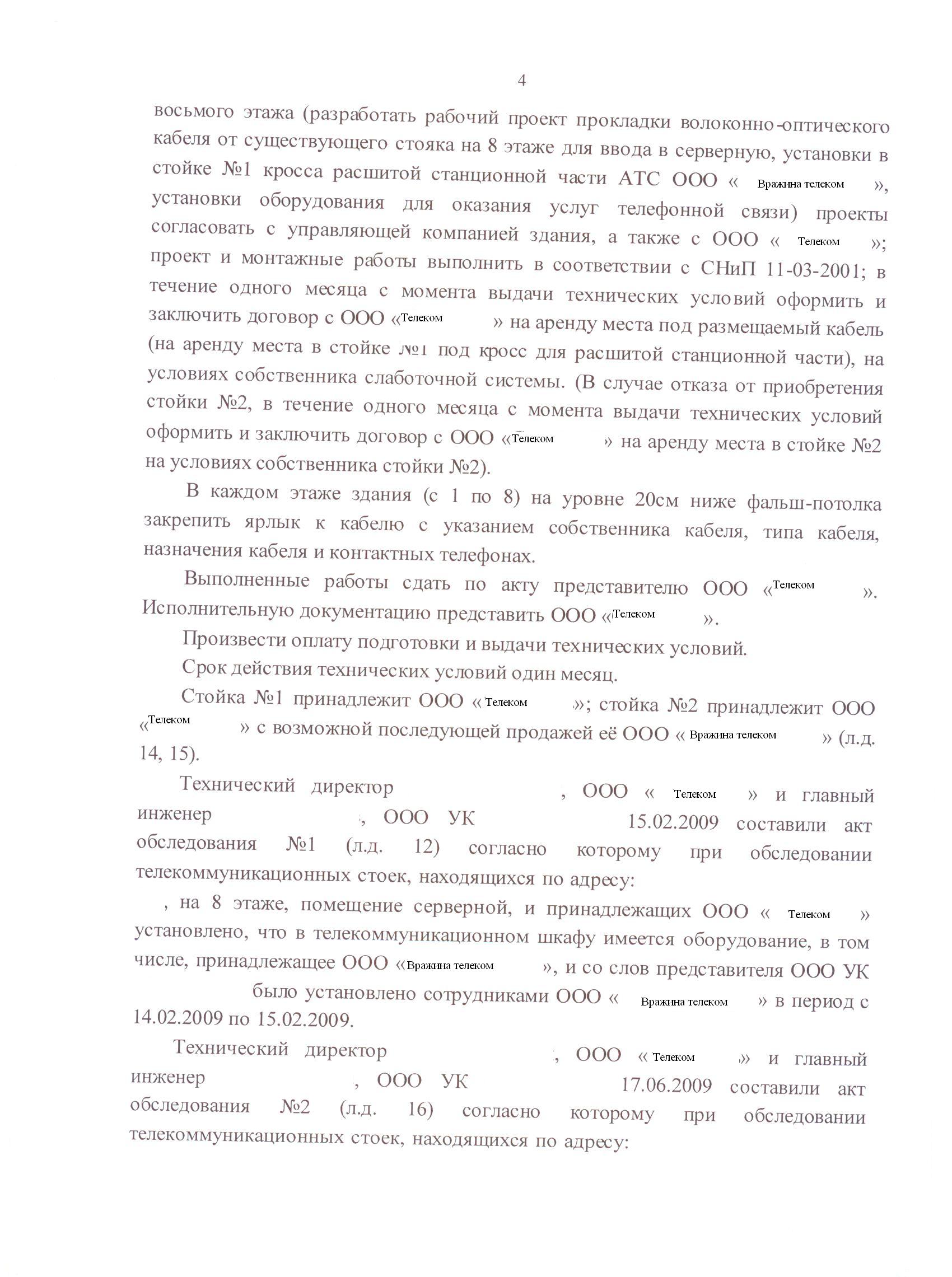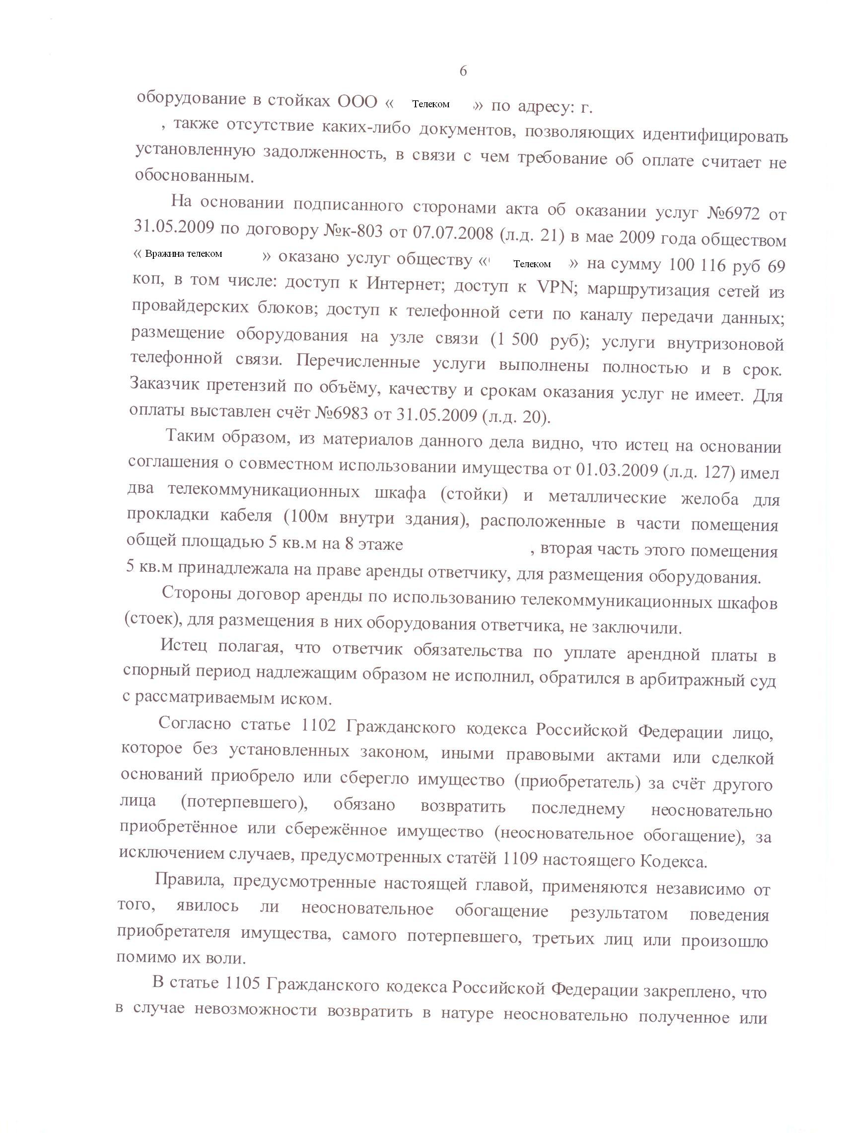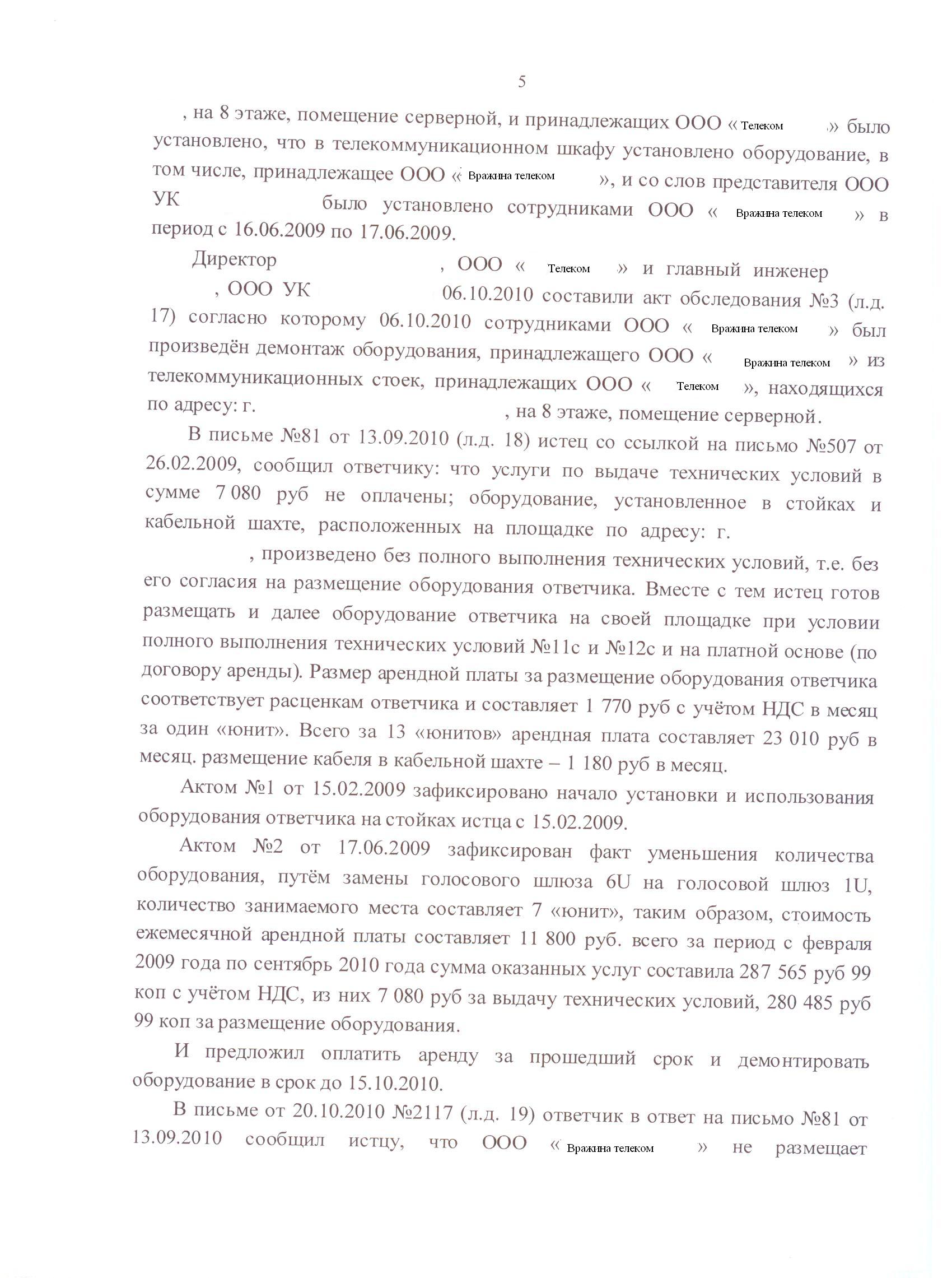 Сутяжник Posted April 26, 2011 Posted April 26, 2011 Добрый день! Имеется следующая ситуация, Провайдер 1 назовём его ООО "Телеком" построил в здании Бизнес центра (20 этажей) инфраструктуру в виде а) Кабельной шахты от подвала до верхнего этажа. б) 19" Стоек на 3,5,8,11,14,18 этажах в) СКС на этажах с кроссировкой в одной из стоек пункта Б. Все работы выполнял сторонний подрядчик. Далее провайдер 2 назовём его "Вражина телеком" по предварительной устной договорённости с нам (ООО "Телеком") разместил свой кабель в нашей кабельной шахте здания от подвала до 8го этажа, а так же разместил оборудование в нашей стойке на 8 этаже, в виде кросса оптического, свитча, голосового шлюза, в последствии обязавшись эту стойку выкупить себе в собственность. Нами было направленно письмо Вражине телеком о необходимости получения ТУ на размещения кабеля и оборудования. ТУ были нами сделаны, и переданы Вражине. Далее по какой причине вражина телеком отказывается покупать стойку, но продолжает размещать в ней своё оборудование в количестве 13 юнитов. Мы пишем претензию о том что ТУ не оплачены и не выполнены, а так же требуем оплатить аренду места в нашей стоке по тарифам оператора ООО "Вражина телеком" (мы так же размещаем своё оборудование у них) так как стойку они оплатить отказались, а место занимают. Мы составляем с собственником здания (управляющей компанией) акт о размещении имущества Вражины в нашей стойке, на составление акта представители вражины не приглашались. Акт подписали наш Тех. директор, и гл. инженер УК. В ответ вражина телеком сокращает кол-во оборудования в нашей стойке до необходимого им минимума, но продолжает занимать 7 юнитов. Мы составляем с собственником здания (управляющей компанией) акт о фиксировании изменения в размещении имущества Вражины в нашей стойке что теперь там не 13 юнитов а 7, в акте указан весь перечень оборудования, на составление акта представители вражины не приглашались. Акт подписали наш Тех. директор, и гл. инженер УК. Далее мы опять пишем письмо о том что если нам не оплатят аренду, то мы вынуждены будем демонтировать их оборудование из своей собственности. В ответ они пишут нам письмо что никакого оборудования они у нас не размешали никогда, и ночью пока никто не видит перетаскивают из нашей стойки своё имущество в свою вновь установленную стойку (у них есть договор с УК о аренде части помещения где стоят стойки). Мы составляем с собственником здания (управляющей компанией) акт о фиксировании изменения в размещении имущества Вражины в нашей стойке что теперь там не 7 юнитов а 0, на составление акта представители вражины не приглашались. Акт подписали наш Тех. директор, и гл. инженер УК. В итоге у нас получается ситуация что они используют нашу кабельную шахту, нашу инфраструктуру (СКС) для оказания услуг связи арендаторам, но отказываются оплачивать размещение оборудования в кабельной шахте, и в стойках за два года. Далее мы подали иск в арбитражный суд. Там предоставили все акты, вызвали свидетелем гл. инженера УК, который всё подтвердил, но суд первой инстанции в иске отказал. Собственно вопрос помогите советом как правильно обжаловать в касации, ибо решение не справедливое. Прилагаю решение суда первой инстанции. С уважением, заранее спасибо. Вставить ник Quote