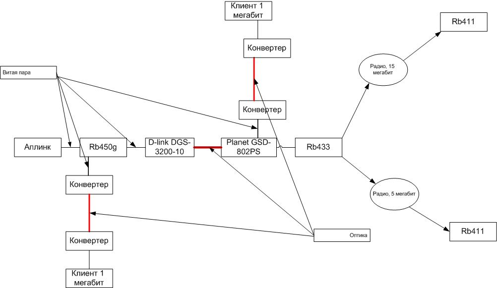 Liner's Posted May 4, 2011 Posted May 4, 2011 Всем привет! Есть такая схема: пров даёт один адрес внешний, типа 555.555.555.555 и шлюз 555.555.555.556 к нему блок внешних адресов 112.112.112.0 - 112.112.112.256 проблема в том как это смаршрутизировать. На клиентах где Rb стоят роутеры на фри с биллингом, модулей под микротики не писалось. Для маршрутизации сегодня поставили в голову rb450g, на нём хотели прописать маршруты а у клиентов уже прописать апи из блока. Тут вылезла проблема, что пойдут глюки с броадкастом, поэтому приняли решение заврнуть всё во влан. Но с микротиком дружу плохо, подскажите, как и где лучше завернуть траф. предполагалось что вилан заворачивается на rb433 сразу с радио интерфейса и пропускается до головного микротика, где разворачивается и маршрутизируется на аплинк. клиенты же просто на порту заворачиваются на свитче (или головном) и также разворачиваются на головном. Сейчас траф от одного rb411 идёт к другому, и потом уже на шлюз прова, получается двойная нагрузка на один из каналов, для этого и запросили блок внешних апи, вопрос тепереь как правильно им воспользоваться Правильным ли будет такое решение, или есть альтернативы? подскажите, как заворачивать во влан с радио интерфейса и по умолчанию пропускает ли микротик тегированный траф? Вставить ник Quote