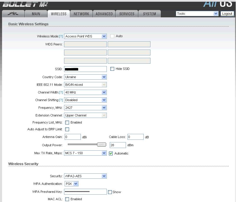 life23 Posted July 6, 2011 Posted July 6, 2011 Всем привет! Помогите с настройкой девайса BULLET M2HP. до того как приобрел сей девайс, стояла точка доступа ECB3220. Клиенты подключались к ней. эта точка было подключена к серверу. Сгорела, поставил буллет но не могу настроить. Только одного клиента принимает и все... остальные видят точку доступа но не могут подключится. Буллет настроил так: Режим: точка доступа. в Wirelles режим: Bridge. клиенты работают в диапазоне сети 192.168.0.* IP Сервера 192.168.0.1. ИП самого булета по лану 192.168.0.10. с безопасностью все правильно. у всех WPA2-PSK. AES. и ключ правильный у всех. Вставить ник Quote