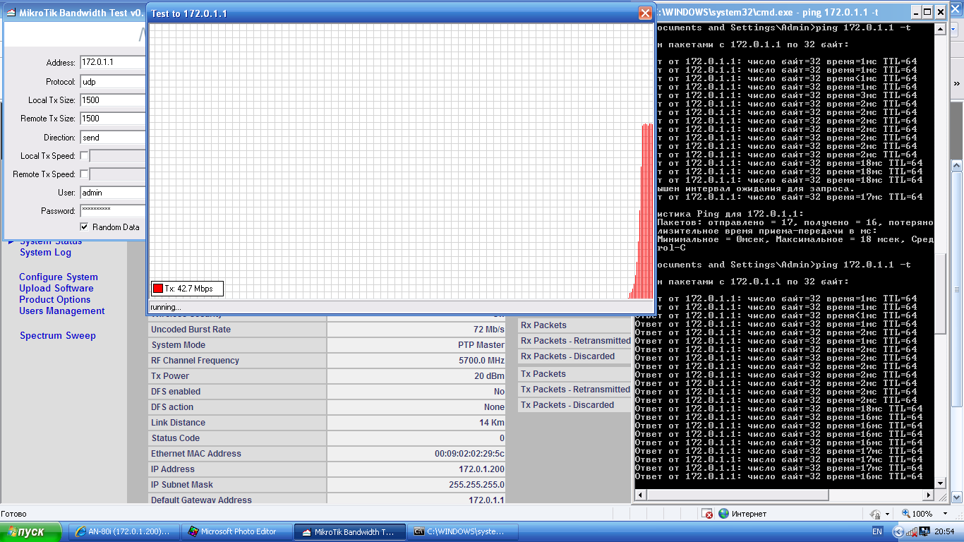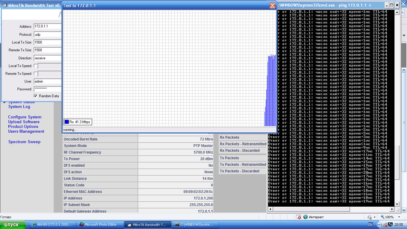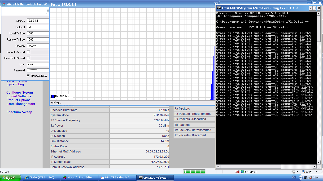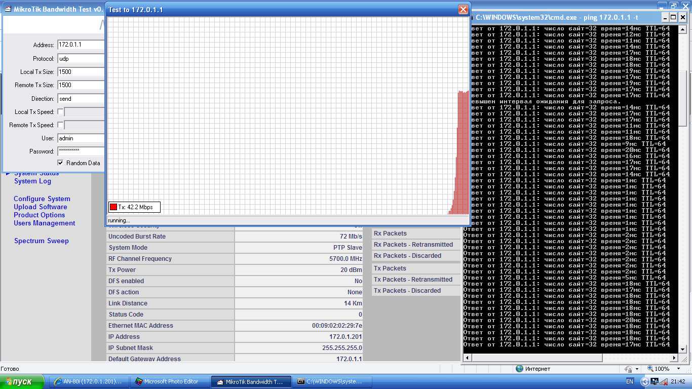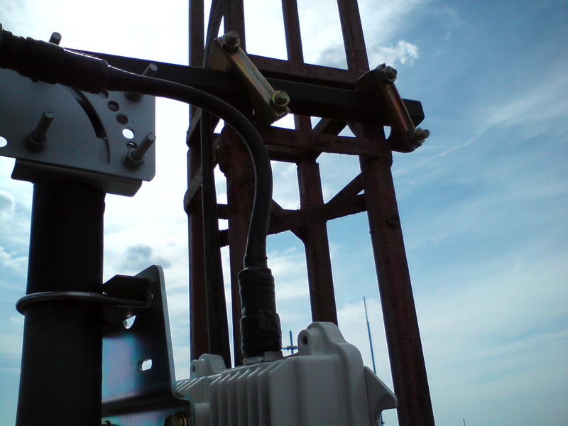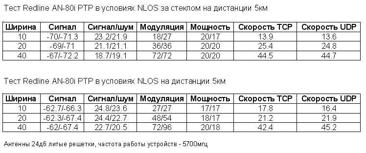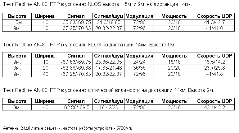 Saab95 Posted July 25, 2011 Author Posted July 25, 2011 Повесил устройство на мачту: На небольшой трубостойке, притянутой к мачте с помощью хомутов от глушителей, разместился Redline AN-80i с литой антенной решеткой 24дб. Кабель от устройства к антенне максимально короткий. Кабель UTP экранированный и подключен к коммутатору через грозозащиту. Конечно крепеж устройства не удобный. Крепить ленточными хомутами, как рекомендует производитель сложно, а если работать одному то и вообще не возможно, т.к. надо одной рукой придерживать устройство, а другой просовывать хомут в прорези. В итоге для крепежа был выбран хомут от какой-то антенны, который подошел под крепежные отверстия в устройстве. Скан спектра показал, насколько же сильно фонит сверх своей полосы микротик: Его опорная частота 5650, полоса 20мгц, а на самом деле занимает все 60. Спектранализатор Redline AN-80i это хорошо показывает. Клиентское устройство размещено на расстоянии 5км, антенна так же 24дб, видимость перекрывает высокий тополь и край многоэтажного дома: Сначала антенну разместил просто на чердаке за стеклом вот так: Сделал серию тестов, открыл окно и выставил устройство так, чтобы ничего не мешало прохождению радиоволн: Так же сделал серию тестов. Потом разместил антенну на крыше, но уровни сигналов и полученные результаты ничем от полученных на чердаке с открытым окном не отличались, поэтому в итоговые результаты не вошли. Методика измерений такова - устанавливалась полоса 10, 20 и 40 мгц, для каждой ширины канала настраивались антенны по максимальным уровням сигналов и запускался тест iperf'ом по TCP и UDP, полученные результаты можете увидеть вот в этой табличке: Результаты тестирования Redline AN-80i PTP на расстоянии 5км в NLOS Максимальная пропускная способность в полосе: 10мгц - 17 мегабит 20мгц - 25 мегабит 40мгц - 45 мегабит Так же запускал тест с помощью утилиты тестирования пропускной способности от микротика, вот результаты, там же можно увидеть и пинги: Видно что пинги выше 20мс не поднимаются даже при максимальной нагрузке. Потерь пакетов нет. IPTV можно смотреть без проблем. Вот скрины работы jperf: По TCP тест скорости запускался в 10 потоков, т.к. в один не получалось получить максимальные результаты. По UDP тест в один поток успешно полностью загружал канал. Замечания по работе устройств: Результаты работы устройств за стеклом и без, показали не сильную разницу в показаниях максимальной пропускной способности. Установка максимальных модуляций вручную возможна и устройства будут на них работать, однако это только понижает максимальную пропускную способность. Если поставить установку модуляции в авторежим, будет установлена более низкая, однако на ней пропускная способность будет в итоге выше. Это зависит от того, что на высоких модуляциях больше количество переповторов, что и понижает максимальную пропускную способность. Преграды на линии передачи сигнала влияют на качество канала, получение высоких уровней сигналов не увеличивает пропускную способность. Скрины вкладок статуса устройств (вверху Master, внизу Slave): Вставить ник Quote