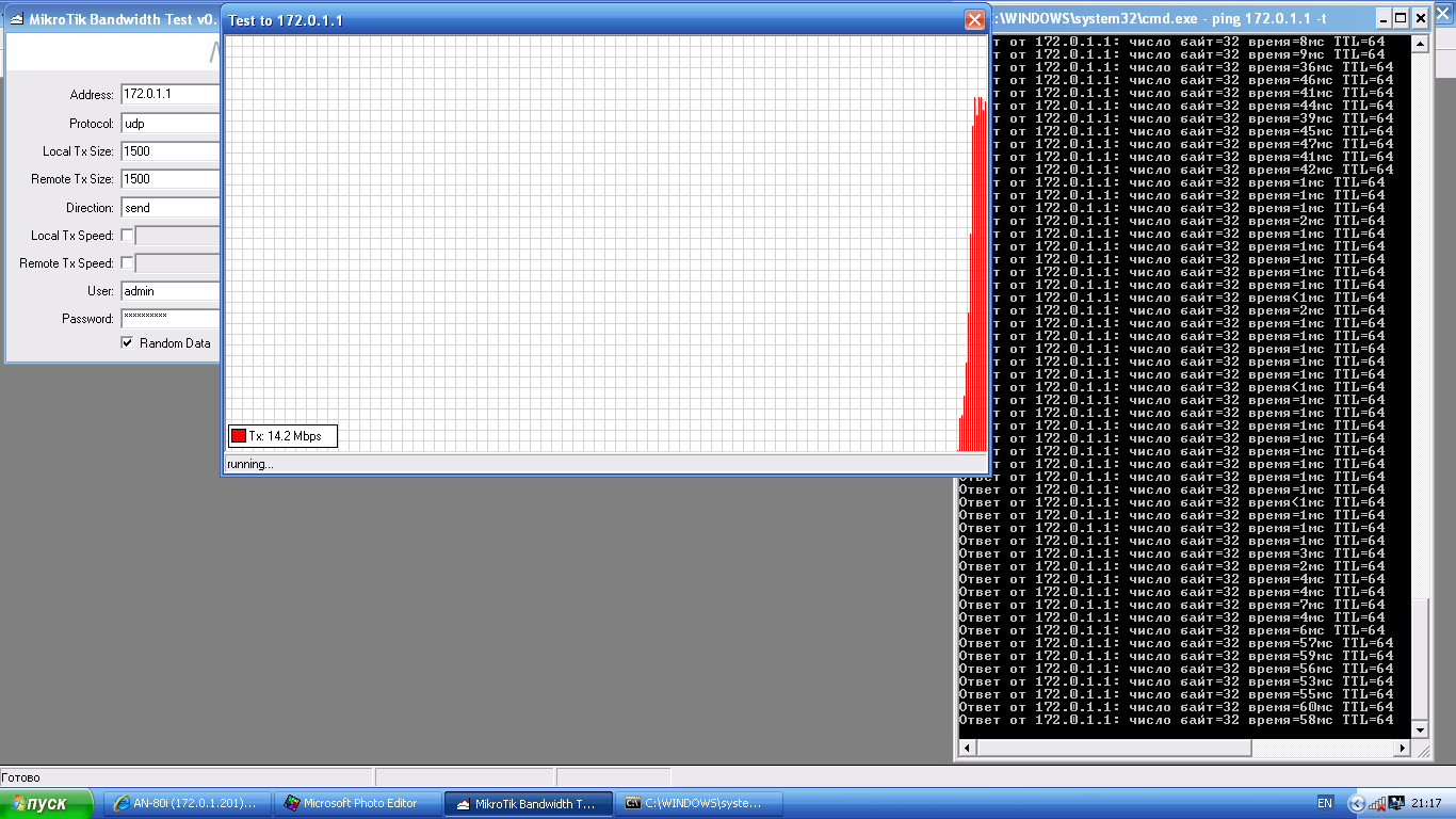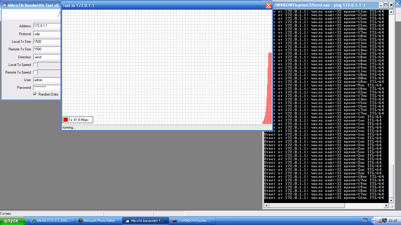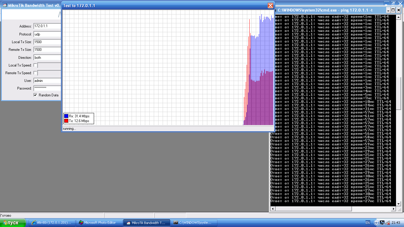 Jefferson Posted July 21, 2011 Posted July 21, 2011 По iperf 75 мегабит, по Bandwidth Test от микротика 70 мегабит. Пинги во время простоя менее 1мс, во время передачи данных увеличиваются, а вместе с ними увеличивается и количество повторно переданных пакетов, что говорит о проблеме на радиоканале. Устройства тестировались в разных помещениях с подключенными внешними антеннами, однако wimax плохо работает в помещениях, и показать себя во всей красе может только при работе на улице, что в ближайшее время и будет сделано. Интересная железка, эдакая смесь бульдога с носорогом радио wifi, mac 802.16d... Приведите хоть один пример, почему стоит выбрать именно redline а не infinet, например, у которого к дуплексе больше 200 мбит (только не тот, который худо-бедно тарахтит у Saab95, а актуальное железо с ппс за 200к и вылизанным mimo)? Хех, было бы интересно увидеть результаты испытаний на улице, хотя 90 мегабит конечно смотрится уныло... PS: пинг на винде <1 мсек ооочень информативен, учитывая что это может быть как 0,01 мсек так и 0,99 мсек. Вставить ник Quote