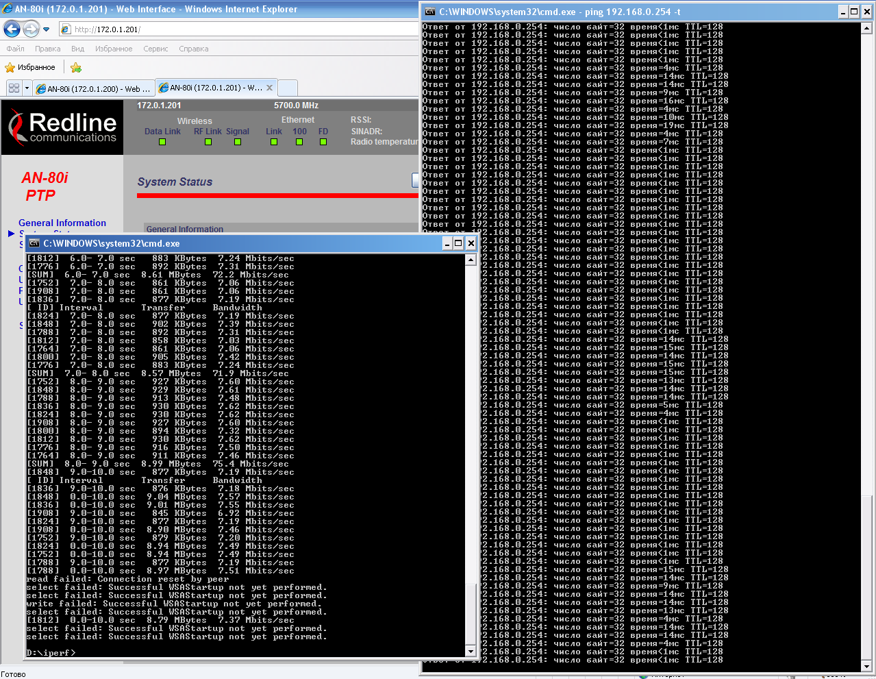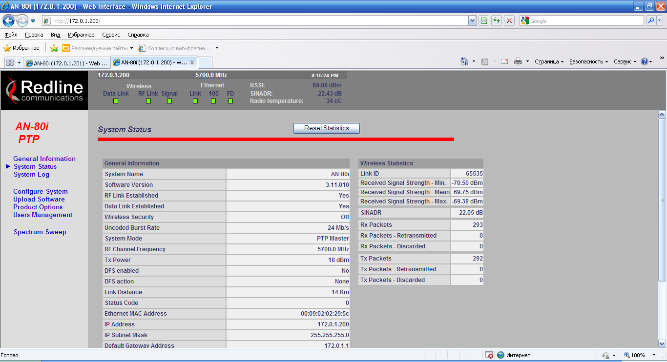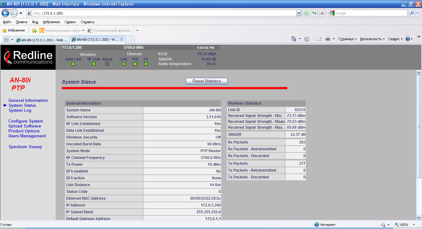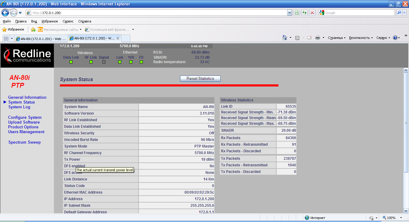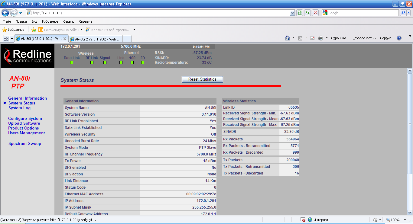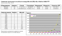 Saab95 Posted July 20, 2011 Posted July 20, 2011 Redline AN-80i предназначен для создания каналов связи точка-точка на расстояниях до 80км, на скорости до 90 Mbps (реальная пропускная способность на ethernet порту), максимальная пакетная производительность - 176000 pps. Устройство поддерживает ширину каналов 3.5, 5, 7, 10, 14, 20, 28, 40 MHz, частоты 5250-5850 или 3300-3700. Поддерживает ARQ (гарантированную доставку пакетов) и динамический выбор модуляции в зависимости от уровня сигнала и наличии помех. Максимальная выходная мощность - 25dBm. Устройство так же поддерживает шифрование. Задержка передачи данных 2мс. С более подробным описанием устройства можно ознакомиться по этой ссылке - http://www.unidata.com.ua/index.php?pg=86&lang=rus&rand=5033484 Или на сайте производителя - http://www.redlinecommunications.com/en/products/an-80i-radio-platform Redline AN-80i поставляется в коробке, в которой находятся 2 устройства, крепежные наборы и блоки питания, а так же CD диск с документацией: Собственно само устройство, крепежная пластина (вверху над блоком питания) и болтики к ней, 2 больших ленточных хомута для установки устройства на трубу, блок питания на 48 вольт, инструкция по монтажу и бумажная инструкция, в которой можно найти сведения о IP-адресе устройства и пароле. Так же в поставке присутствует высокочастотный кабель с Г-образным разъемом: Redline AN-80i со всех сторон: Разъем для подключения витухи находится в углублении, вставить просто, а чтобы вынуть нужно тонкой отверткой отжать фиксатор. На столе легко, а вот на мачте думаю будет не очень удобно. Хотя такие устройства обычно вешают и больше не трогают. Кабель вводится через гермоввод, состоящий из толстого резинового сальника и металлической шайбы: Питание устройства осуществляется от блока питания PoE 48 вольт, идущего в комплекте: Можно использовать его, а можно подключать к коммутатору с PoE портами. В настройке устройства достаточно просты: Нужно только установить IP-адрес и шлюз, а так же рабочую частоту, мощность на передачу, ширину канала и максимальную модуляцию, включить адаптивную модуляцию в зависимости от условий радиолинка, а так же выбрать режим работы устройства - Master или Slave. Настройка занимает всего минуту. Так же в устройстве есть спектранализатор, который позволяет просканировать эфир на предмет наличия других беспроводных устройств: После настройки обоих устройств они соединяются между собой (одно устройство должно быть Master, второе - Slave, иначе они между собой не соединятся), вот что показывает окно статуса: В нем можно узнать уровень сигнала, текущую модуляцию, мощность на передачу и количество переповторов. По количеству переповторов можно судить о проблемах с качеством связи, в идеале их не должно быть вовсе. При тестировании скорости на столе удалось получить следующие результаты: По iperf 75 мегабит, по Bandwidth Test от микротика 70 мегабит. Пинги во время простоя менее 1мс, во время передачи данных увеличиваются, а вместе с ними увеличивается и количество повторно переданных пакетов, что говорит о проблеме на радиоканале. Устройства тестировались в разных помещениях с подключенными внешними антеннами, однако wimax плохо работает в помещениях, и показать себя во всей красе может только при работе на улице, что в ближайшее время и будет сделано. Вставить ник Quote
