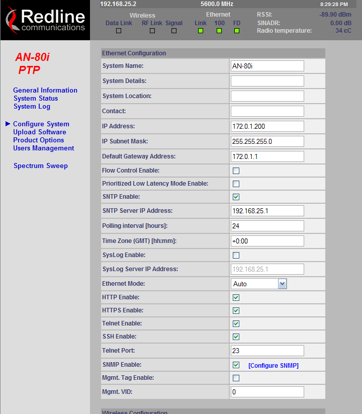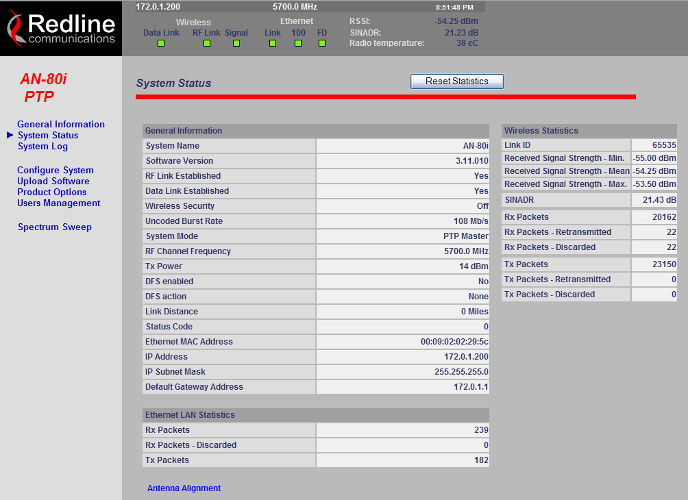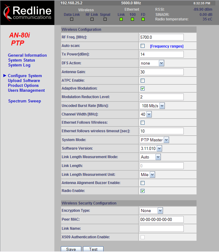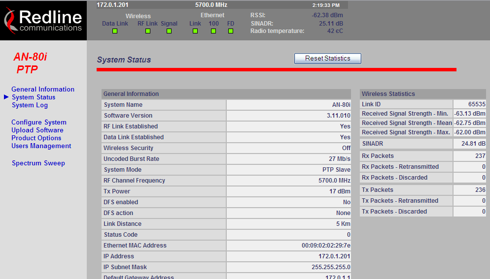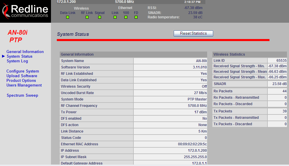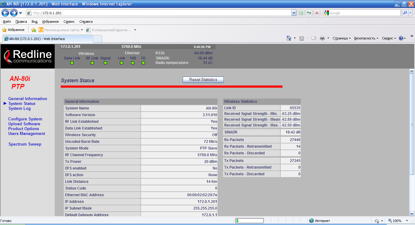 Saab95 Posted July 20, 2011 Posted July 20, 2011 Redline AN-80i предназначен для создания каналов связи точка-точка на расстояниях до 80км, на скорости до 90 Mbps (реальная пропускная способность на ethernet порту), максимальная пакетная производительность - 176000 pps. Устройство поддерживает ширину каналов 3.5, 5, 7, 10, 14, 20, 28, 40 MHz, частоты 5250-5850 или 3300-3700. Поддерживает ARQ (гарантированную доставку пакетов) и динамический выбор модуляции в зависимости от уровня сигнала и наличии помех. Максимальная выходная мощность - 25dBm. Устройство так же поддерживает шифрование. Задержка передачи данных 2мс. С более подробным описанием устройства можно ознакомиться по этой ссылке - http://www.unidata.com.ua/index.php?pg=86&lang=rus&rand=5033484 Или на сайте производителя - http://www.redlinecommunications.com/en/products/an-80i-radio-platform Redline AN-80i поставляется в коробке, в которой находятся 2 устройства, крепежные наборы и блоки питания, а так же CD диск с документацией: Собственно само устройство, крепежная пластина (вверху над блоком питания) и болтики к ней, 2 больших ленточных хомута для установки устройства на трубу, блок питания на 48 вольт, инструкция по монтажу и бумажная инструкция, в которой можно найти сведения о IP-адресе устройства и пароле. Так же в поставке присутствует высокочастотный кабель с Г-образным разъемом: Redline AN-80i со всех сторон: Разъем для подключения витухи находится в углублении, вставить просто, а чтобы вынуть нужно тонкой отверткой отжать фиксатор. На столе легко, а вот на мачте думаю будет не очень удобно. Хотя такие устройства обычно вешают и больше не трогают. Кабель вводится через гермоввод, состоящий из толстого резинового сальника и металлической шайбы: Питание устройства осуществляется от блока питания PoE 48 вольт, идущего в комплекте: Можно использовать его, а можно подключать к коммутатору с PoE портами. В настройке устройства достаточно просты: Нужно только установить IP-адрес и шлюз, а так же рабочую частоту, мощность на передачу, ширину канала и максимальную модуляцию, включить адаптивную модуляцию в зависимости от условий радиолинка, а так же выбрать режим работы устройства - Master или Slave. Настройка занимает всего минуту. Так же в устройстве есть спектранализатор, который позволяет просканировать эфир на предмет наличия других беспроводных устройств: После настройки обоих устройств они соединяются между собой (одно устройство должно быть Master, второе - Slave, иначе они между собой не соединятся), вот что показывает окно статуса: В нем можно узнать уровень сигнала, текущую модуляцию, мощность на передачу и количество переповторов. По количеству переповторов можно судить о проблемах с качеством связи, в идеале их не должно быть вовсе. При тестировании скорости на столе удалось получить следующие результаты: По iperf 75 мегабит, по Bandwidth Test от микротика 70 мегабит. Пинги во время простоя менее 1мс, во время передачи данных увеличиваются, а вместе с ними увеличивается и количество повторно переданных пакетов, что говорит о проблеме на радиоканале. Устройства тестировались в разных помещениях с подключенными внешними антеннами, однако wimax плохо работает в помещениях, и показать себя во всей красе может только при работе на улице, что в ближайшее время и будет сделано. Вставить ник Quote