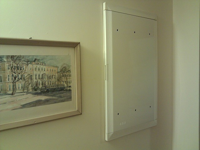 -Ars- Posted August 6, 2011 Posted August 6, 2011 (edited) Мы перед въездом в квартиру делали капитальный ремонт. Поэтому заказал электрику и разводку слаботочки. Шкафчик с роутером расположил как можно ближе к центру квартиры, чтобы "добивало" отовсюду. Как выглядит шкафчик снаружи - см. на приаттаченной фотки, картинка 9-й гимназии - для масштаба :) Внутренности показывать не буду - страшно. В глубину шкафчик как раз с панельный блок, так, что с другой стороны его надо было заштукатуривать. Роутер в коробке не влез, пришлось прикручивать голую плату ;) А эдимаксовский свич (на который в оригинале не рассчитывал, но вот потребовался) влез без проблем. Там же 2 розетки на 220 + соответственно 2 блока питания для СРЕ и свича. В шкафчике же сходятся разводка коаксиала для ТВ и телефонные провода Edited August 6, 2011 by -Ars- Вставить ник Quote