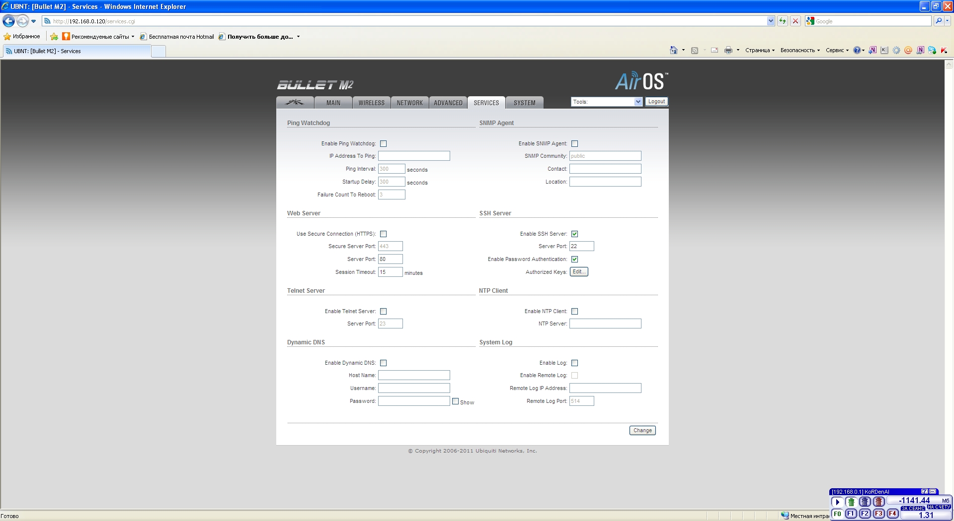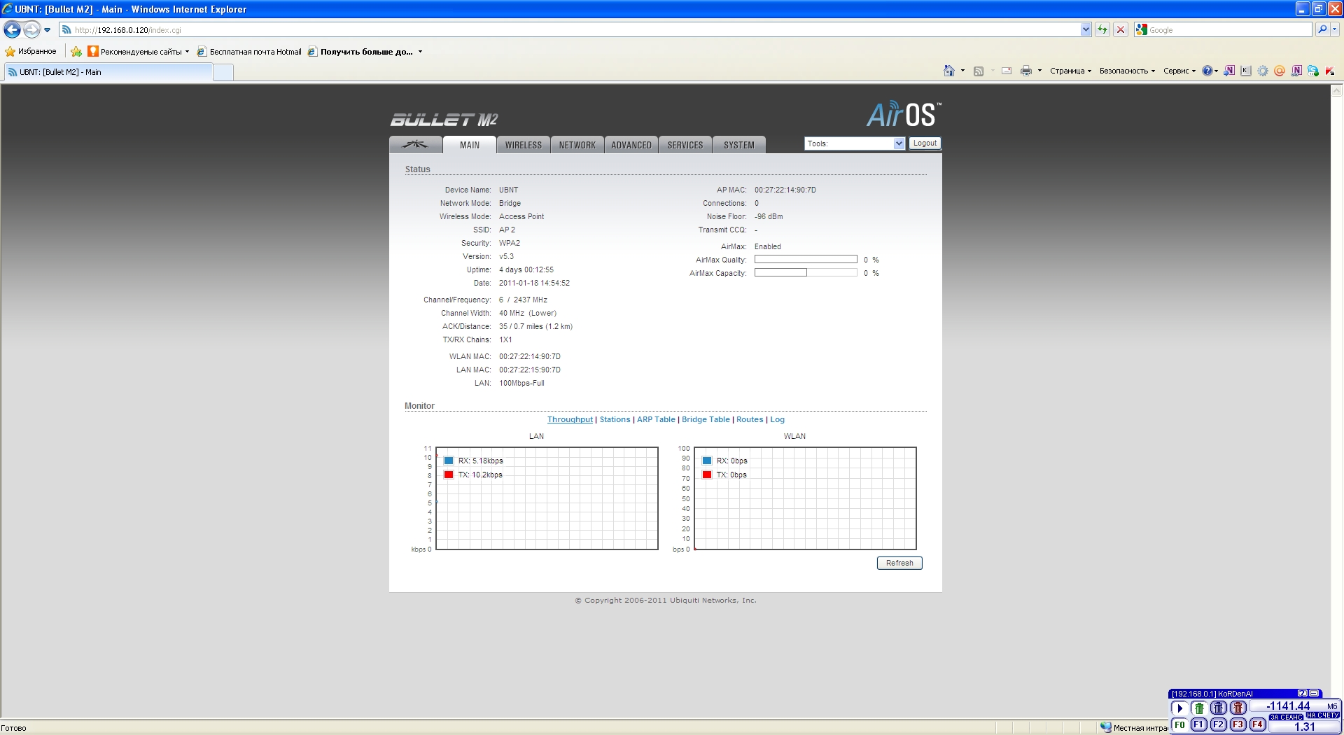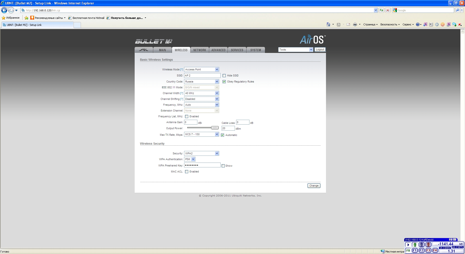 xKoRDenAlx Posted August 16, 2011 Posted August 16, 2011 Добрый день. Господа, прошу не кидаться помидорами. Я начинающий в сфере WiFi, но никогда не имел проблем с домашними точками доступа. Нашей организации (яхт-клубу) потребовалось получить интернет на большой территории, с которой домашние точки доступа, даже с усиленной антенной не справлялись. Были купленны 2 точки доступа Bullet M2, две антенны АX-2411R, два блока питания и грозозащита. По задумке есть желание объединить две точки доступа с помощью WDS. Но, хотелось бы сначала настроить одну, как точку доступа. На столбе установлен кронштейн с антенной, в нее ввернута точка доступа, от нее кабель через грозозащиту в блок питания и от блока питания в свитч, в который также подключен ADSL модем. DHCP сервер поднят на модеме. Точку доступа настроил как на картинках. При подключении клиенты не подключаются, идет запрос пароля, ввожу пароль и обрыв. Подумал, что возможно брак точки, точка сменена на вторую, прошито новейшей прошивкой с сайта производителя. И никаких изменений. Делаю выводы - не хватает знаний или кривые руки. Прошу помощи у корифеев. Пока задача поднять точку доступа, чтобы к ней могли подсоединятся клиенты и чтобы клиенты получали айпишник от DHCP сервера модема. Вставить ник Quote