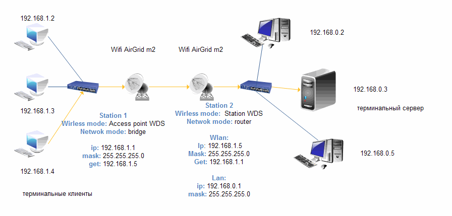 boby Posted September 16, 2011 Posted September 16, 2011 (edited) Задача: соединить 2 локальные сети через wi-fi станции Airgrid M2 ОС: AirOS. Так что бы из сети (a)(на рис. 192.168.1.4) клиенты подключались только по RDP к терминальному серверу (на рис. 192.168.0.3 - оранж.), который находится в сети (б), но при этом не могли видеть остальные компьютеры в сети (б)(на рис. 192.168.0.5 - 192.168.0.255).В режиме бриджа (2 точки) все нормально, если поменять настройки сети (a). А в режиме bridge + router проблема - если пинговать с 192.168.1.x на 92.168.0.x пингуется только сама точка (адрес wlan + lan), а 192.168.0.3 нет и соответственно по RDP тоже не получается. А из сети (б) в (a) все норм. Пока не получается настроить маршрутизацию. Вообщем уважаемые гуру нужна ваша помощь, как правильно все настроить. Спасибо. Station 1 Wirless mode: Access point WDS Netwok mode: bridge ip: 192.168.1.1 mask: 255.255.255.0 get: 192.168.1.5 Station 2 Wirless mode: Station WDS Netwok mode: router Wlan: Ip: 192.168.1.5 Mask: 255.255.255.0 Get: 192.168.1.1 Lan: ip: 192.168.0.1 mask: 255.255.255.0 Edited September 16, 2011 by boby Вставить ник Quote