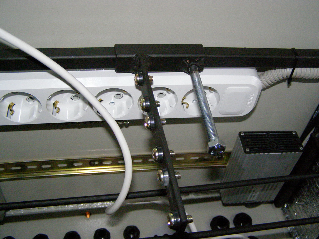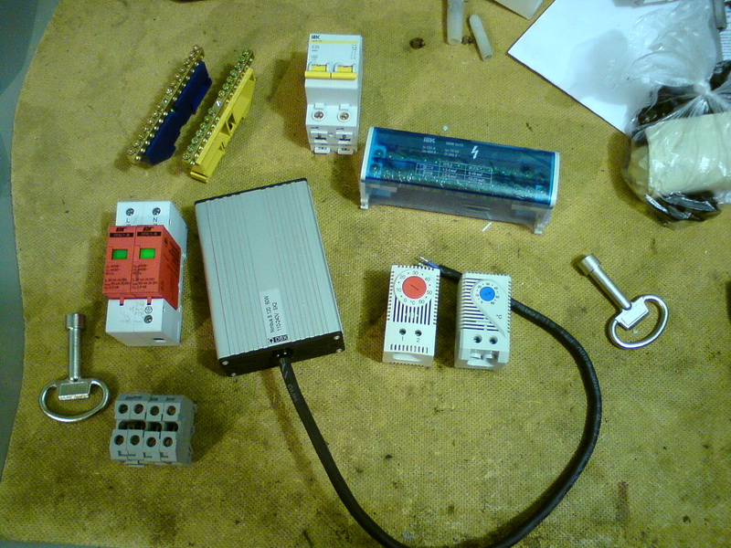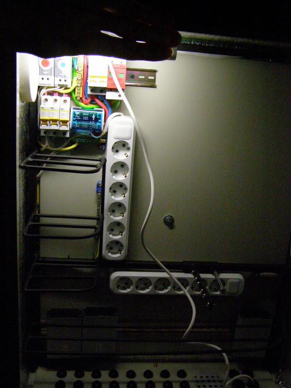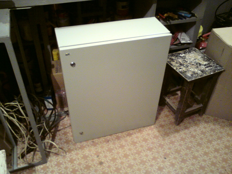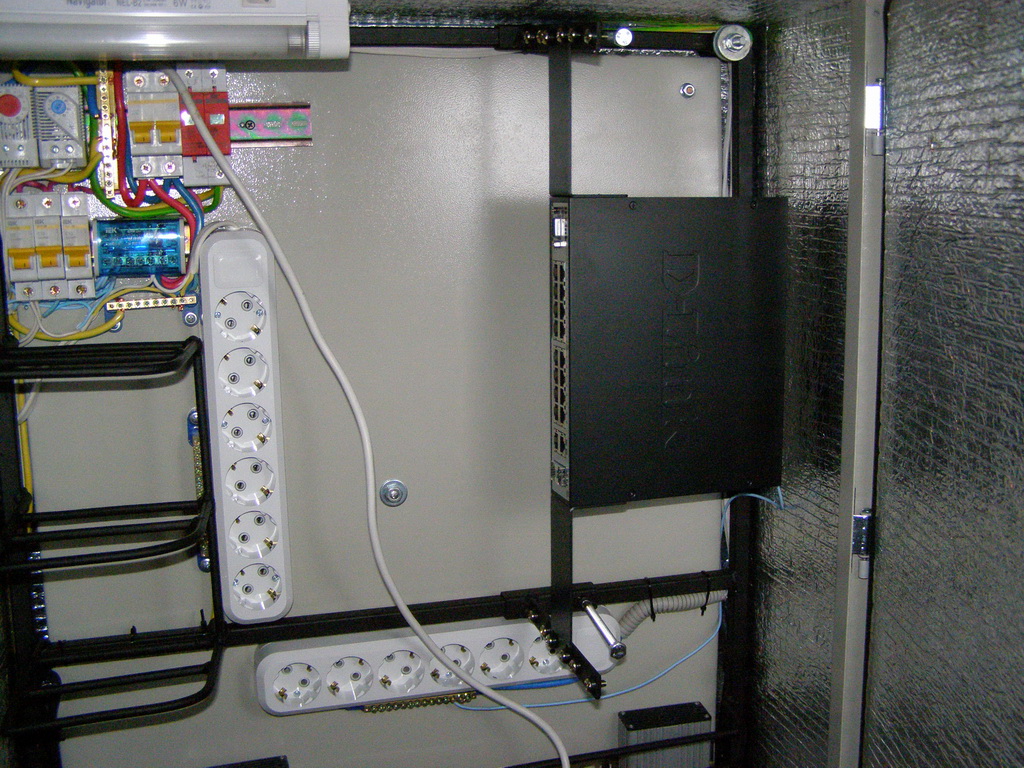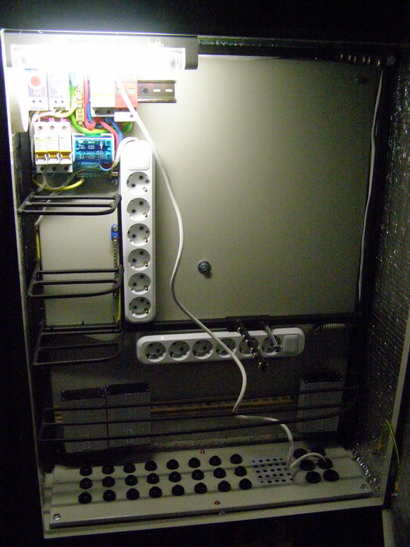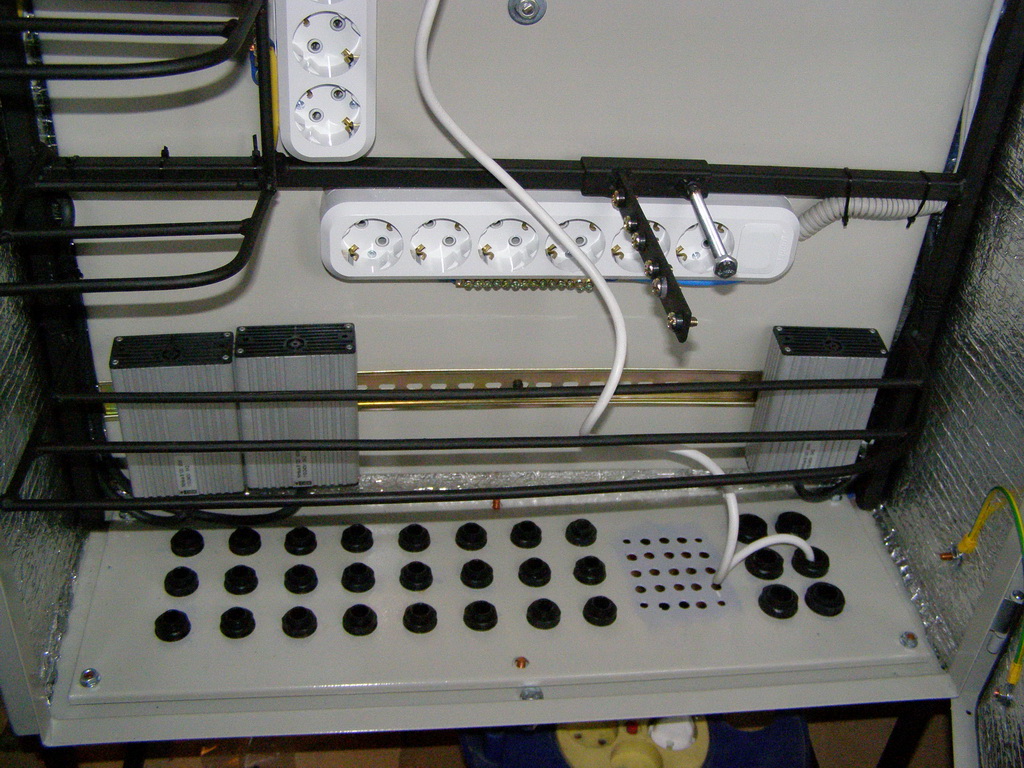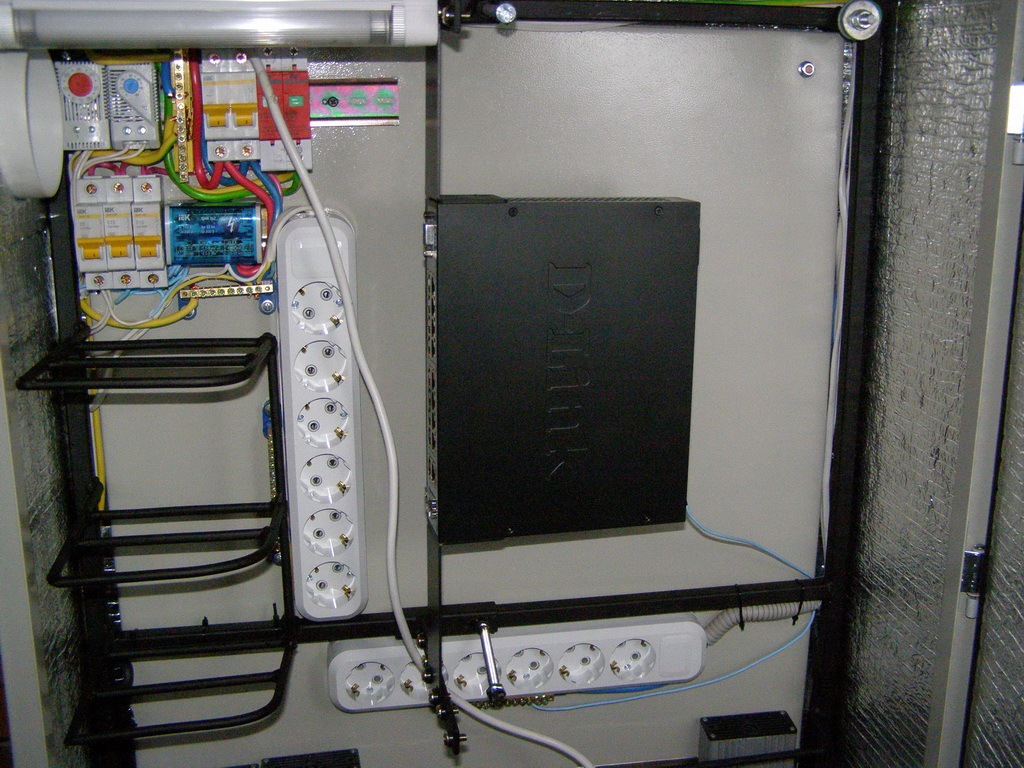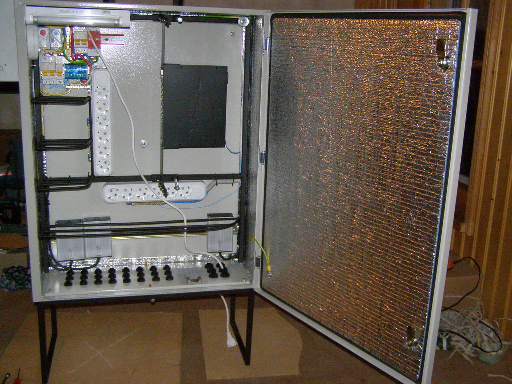 Saab95 Posted October 23, 2011 Author Posted October 23, 2011 Сделал ящик для оборудования, размером 600х800х250мм на базе IEKовского уличного ящика. Вот что получилось: Общий вид внутренностей ящика Вверху лампа для освещения, регуляторы включения вентилятора и нагревателей, автоматы и разрядник на 400 вольт. 2 блока розеток и 3 нагревательных элемента. 3 шины заземления. 3 маленьких полочки и одна большая внизу. Внутри крепежная планка на 3U, регулируемая по глубине с помощью 2-х болтов фиксаторов. Внизу гермовводы, позволяющие ввести 24 тонких кабеля и 6 толстых. Внутри ящика металлическая рамка сделанная их квадратной профильной трубы, полки сделаны из стального прутка круглого сечения диаметром 6мм. Сварено полуавтоматом. Крепеж коммутаторов с регулировкой по глубине В металлической пластине просверлены отверстия и нарезана резьба, можно расположить 3 коммутатора или любых других устройства, регулируются посредством полозъев, которые потом фиксируются от перемещений двумя болтами. Двигать можно в широких пределах: Крайние положения коммутатора Внутри расположен вводный автомат и 3 маленьких, один для освещения, нагрева и охлаждения, другие два каждый на свои блоки розеток: Вид на автоматы Охлаждение осуществляется с помощью вентилятора, расположенного в маленьком ящике сбоку основного. Этот ящик выполняет роль влагоотделителя. Вентилятор работает на выдув: Вентилятор с влагоотделителем Включается вентилятор при температуре 45 градусов, выключается при 30. Чтобы исключить самопроизвольное движение воздуха перед вентилятром установлен воздушный клапан, который легко снимается: Воздушный клапан На лето можно его вынимать для обеспечения естественной циркуляции воздуха. Так же внизу ящика просверлены отверстия для доступа воздуха. На первой фотографии ящика видно, что там на магнитике прикреплена полоска пластика. Сделано это для ограничения доступа воздуха в ящик. Стоит вентилятору включиться, как поток воздуха поднимет эту полоску вверх и обеспечит прохождение воздуха внутрь. Если же вентилятор не работает, то циркуляции воздуха через ящик не происходит. Нагрев осуществляется с помошью 3-х нагревателей, каждый мощностью 60 ватт: Нагревательные элементы Мощности нагревателей достаточно, чтобы при уличной температуре -2 градуса нагреть внутренности до 60 градусов, может можно и больше, но не стал повышать ее выше. Следовательно при -35 внутренняя температура будет поддерживатся на необходимом уровне. Включается нагреватель при температуре +6 градусов, выключается при +15, нагреватели обладают достаточно высокой тепловой инерцией, поэтому внутренняя температура поднимается до 20 градусов, т.к. после выключения они продолжают выделять тепло еще около 5-10 минут. Так же вид на гермовводы снизу, которые располагаются на монтажной заглушке, которую легко вынуть: Гермовводы При монтаже ее можно вынуть и поместить через образовывшийся проем оптический кросс, далее зафиксировать болтами и вводить кабели необходимого диаметра. Ящик смонтирован на металлической рамке и имеет удобную ручку для переноски: Ящик со всех сторон За эту рамку его можно крепить к любым поверхностям. Можно поставить на поверхность, и прикрепить за заднюю рамку. Лампа подсветки очень хорошо освещает внутренности ящика, работать можно даже в полной темноте (фото как раз в темноте): Подс