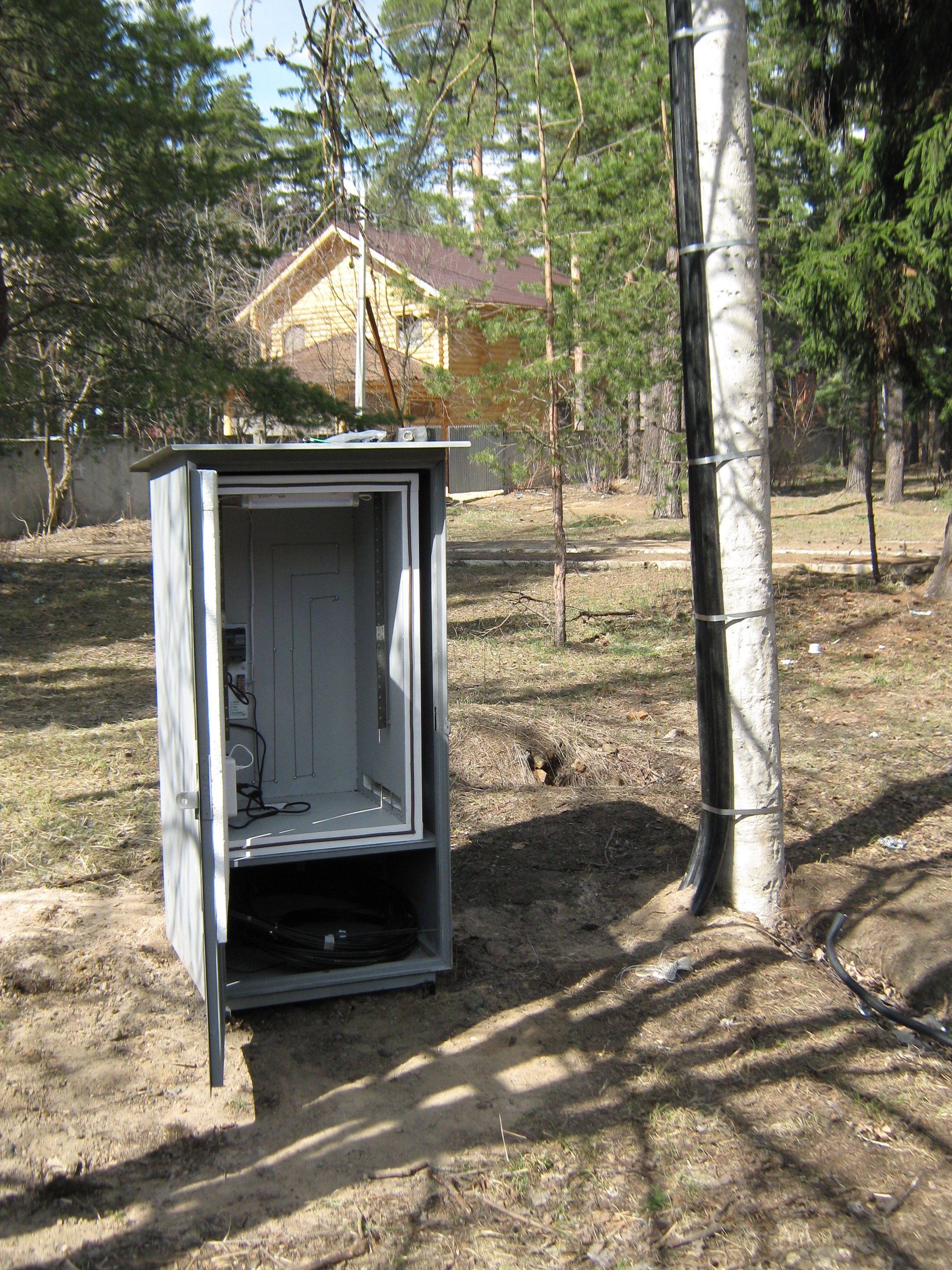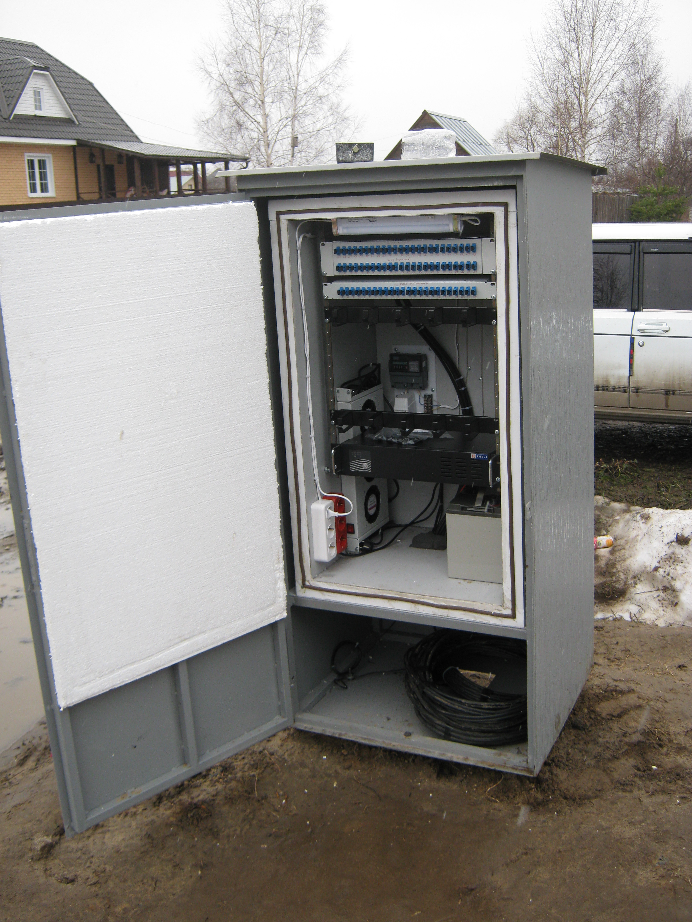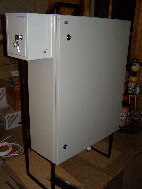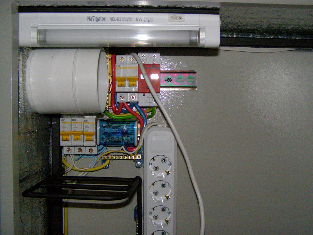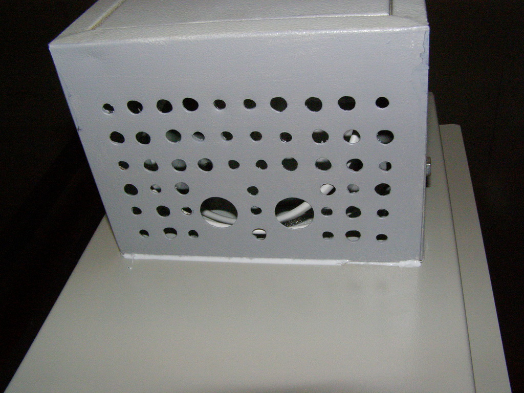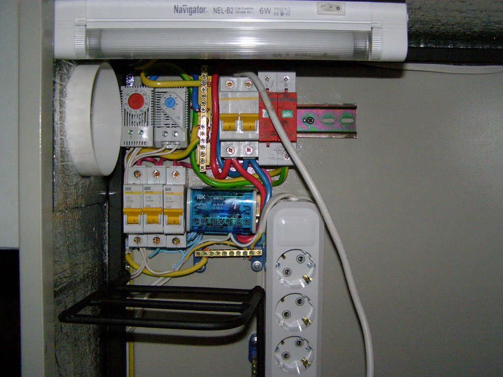 Saab95 Posted October 23, 2011 Author Posted October 23, 2011 Сделал ящик для оборудования, размером 600х800х250мм на базе IEKовского уличного ящика. Вот что получилось: Общий вид внутренностей ящика Вверху лампа для освещения, регуляторы включения вентилятора и нагревателей, автоматы и разрядник на 400 вольт. 2 блока розеток и 3 нагревательных элемента. 3 шины заземления. 3 маленьких полочки и одна большая внизу. Внутри крепежная планка на 3U, регулируемая по глубине с помощью 2-х болтов фиксаторов. Внизу гермовводы, позволяющие ввести 24 тонких кабеля и 6 толстых. Внутри ящика металлическая рамка сделанная их квадратной профильной трубы, полки сделаны из стального прутка круглого сечения диаметром 6мм. Сварено полуавтоматом. Крепеж коммутаторов с регулировкой по глубине В металлической пластине просверлены отверстия и нарезана резьба, можно расположить 3 коммутатора или любых других устройства, регулируются посредством полозъев, которые потом фиксируются от перемещений двумя болтами. Двигать можно в широких пределах: Крайние положения коммутатора Внутри расположен вводный автомат и 3 маленьких, один для освещения, нагрева и охлаждения, другие два каждый на свои блоки розеток: Вид на автоматы Охлаждение осуществляется с помощью вентилятора, расположенного в маленьком ящике сбоку основного. Этот ящик выполняет роль влагоотделителя. Вентилятор работает на выдув: Вентилятор с влагоотделителем Включается вентилятор при температуре 45 градусов, выключается при 30. Чтобы исключить самопроизвольное движение воздуха перед вентилятром установлен воздушный клапан, который легко снимается: Воздушный клапан На лето можно его вынимать для обеспечения естественной циркуляции воздуха. Так же внизу ящика просверлены отверстия для доступа воздуха. На первой фотографии ящика видно, что там на магнитике прикреплена полоска пластика. Сделано это для ограничения доступа воздуха в ящик. Стоит вентилятору включиться, как поток воздуха поднимет эту полоску вверх и обеспечит прохождение воздуха внутрь. Если же вентилятор не работает, то циркуляции воздуха через ящик не происходит. Нагрев осуществляется с помошью 3-х нагревателей, каждый мощностью 60 ватт: Нагревательные элементы Мощности нагревателей достаточно, чтобы при уличной температуре -2 градуса нагреть внутренности до 60 градусов, может можно и больше, но не стал повышать ее выше. Следовательно при -35 внутренняя температура будет поддерживатся на необходимом уровне. Включается нагреватель при температуре +6 градусов, выключается при +15, нагреватели обладают достаточно высокой тепловой инерцией, поэтому внутренняя температура поднимается до 20 градусов, т.к. после выключения они продолжают выделять тепло еще около 5-10 минут. Так же вид на гермовводы снизу, которые располагаются на монтажной заглушке, которую легко вынуть: Гермовводы При монтаже ее можно вынуть и поместить через образовывшийся проем оптический кросс, далее зафиксировать болтами и вводить кабели необходимого диаметра. Ящик смонтирован на металлической рамке и имеет удобную ручку для переноски: Ящик со всех сторон За эту рамку его можно крепить к любым поверхностям. Можно поставить на поверхность, и прикрепить за заднюю рамку. Лампа подсветки очень хорошо освещает внутренности ящика, работать можно даже в полной темноте (фото как раз в темноте): Подс