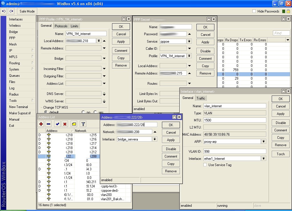 liant Posted December 29, 2011 Posted December 29, 2011 Надо в профиле сервера PPPoE на вкладке Protocols поставить все галочки в NO. А в свойствах самого сервера пункт Keepalive Timeout указать время до отключения клиента в случае пропадания до него связи. Обычно в кабельных сетях ставят 5, в беспроводных 30 (это чтобы при обрыве с точки и последующем подключении соединение не обрывалось), параметр задается в секундах. У меня подтупливает пппое до моего провайдера, а не мой клиент который конектится до моего сервера Вставить ник Quote