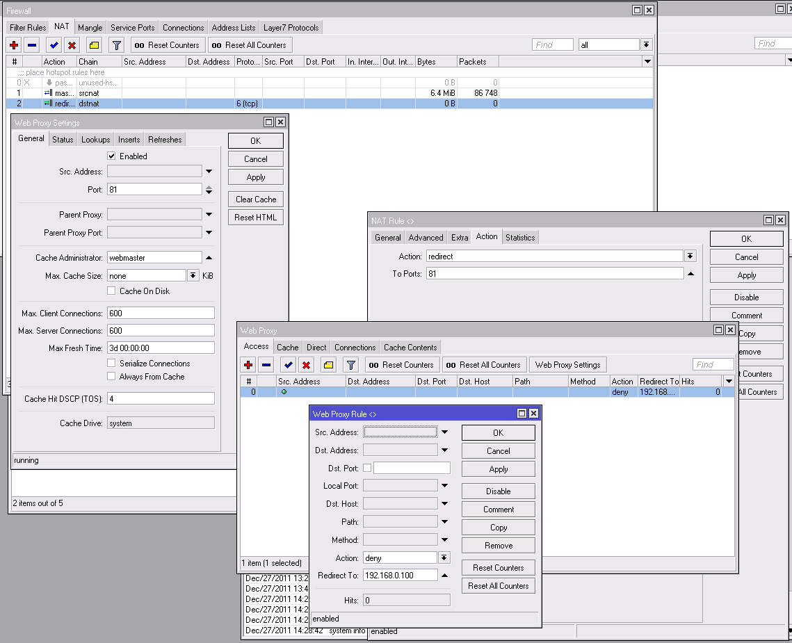 Saab95 Posted December 27, 2011 Posted December 27, 2011 Через WEB-proxy. Вот как-то так. Надо создать правило, которое будет перенаправлять всех из заданного диапазона адресов на 81 порт. В этом правиле указываете что все пакеты TCP с портами 80, 433 и какими там еще хотите (указываются через запятую). Перенаправление работает только в пределах микротика. На этом 81 порту создаете WEB-Proxy, а в нем одно правило с действием DENY и укажите внизу на какой веб сервер перенаправлять запрос - там вы пишите адрес своей странички с рекламой. Только я не пробовал будет ли там ссылка с папками работать, возможно можно только IP-адрес писать. Вставить ник Quote
